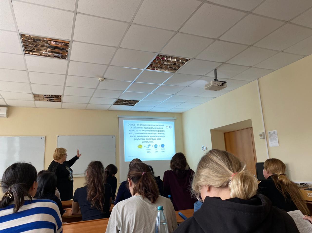 В ходе этой лекции Трофимова Екатерина Владимировна, заведующая кафедрой профессионального и социального образования, поделилась со студентами новой для них информацией. Они смогли узнать больше о том, что такое счастье в его философском, социальном, психологическом аспектах, оценили свой уровень счастья, узнали, как можно стать счастливым человеком.