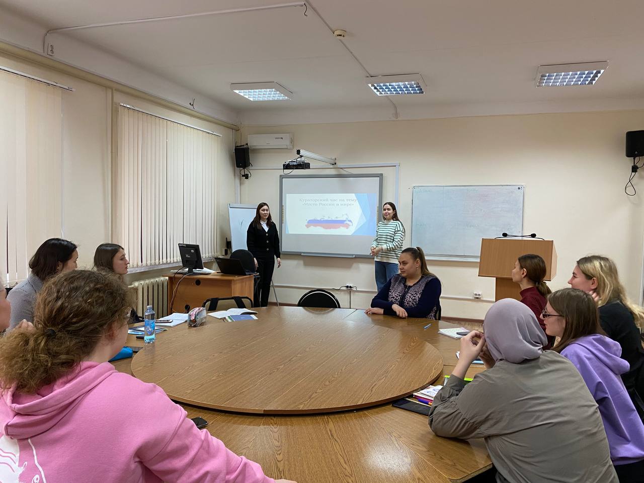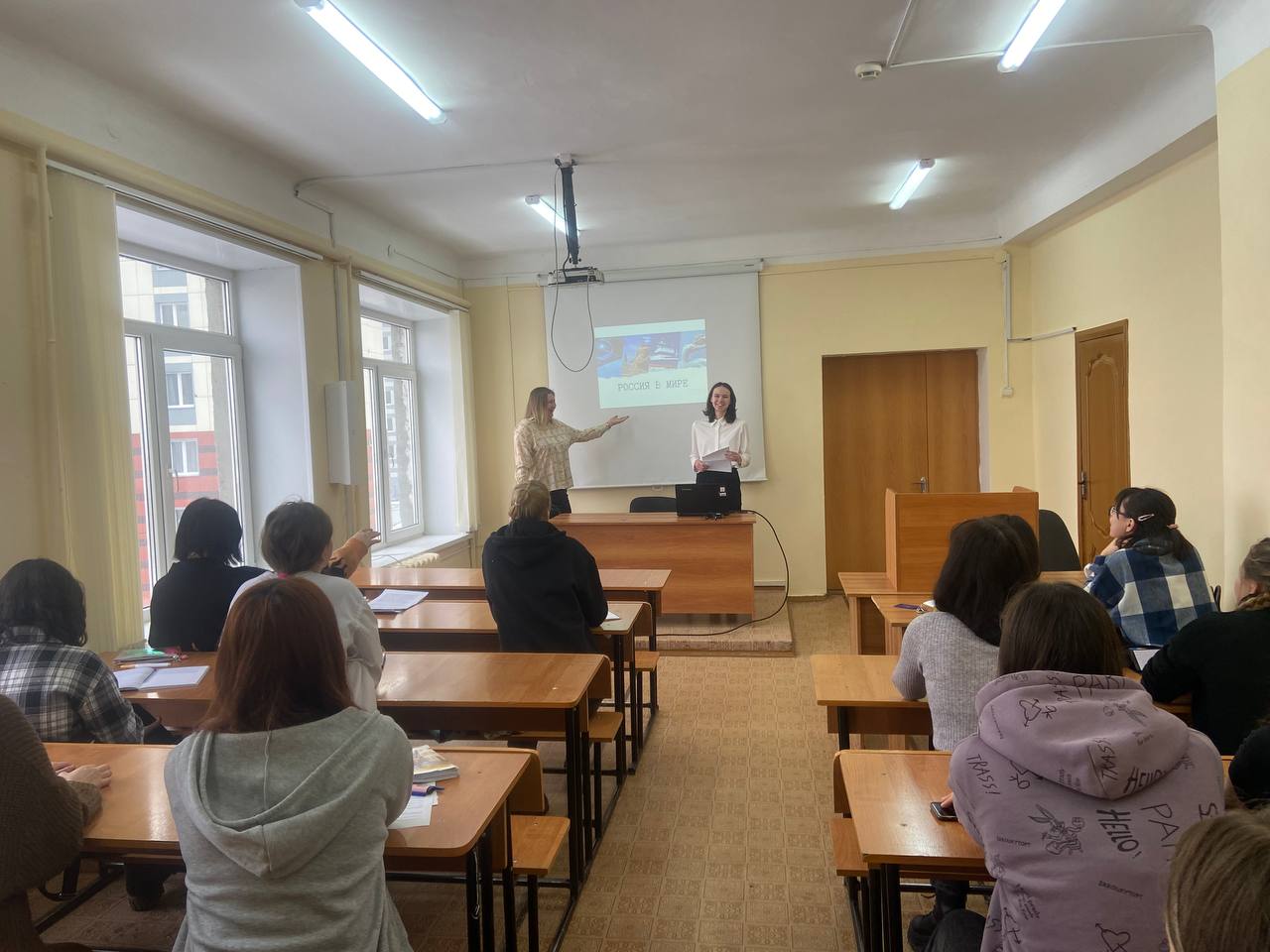 13 февраля 2023 года студентки 3 курса ППОСП 31-20, под руководством старосты группы Мухамадеевой Эльвины, Дыдычкина Екатерина и Ярметова Анна провели беседу с 1 курсом ППОСП 11-22, Габдульманова Ляйсан и Хикматуллина Гульназ провели беседу со 2 курсом ППОСП 21-21 на тему «Россия в мире».