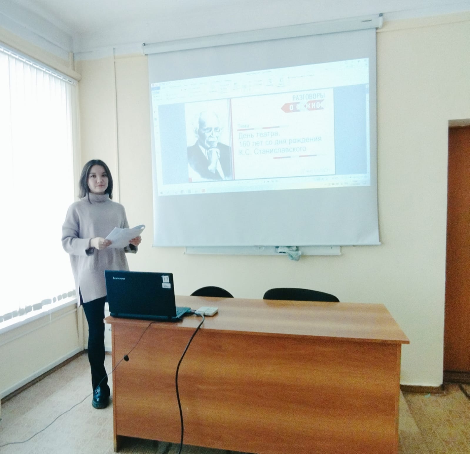 В ходе беседы студенты познакомились с биографией великого актера, режиссера и педагога Константина Сергеевича Станиславского, затем они просмотрели видеоролик, подготовленный ко дню театра, где узнали про  знаменитую на весь мир актерскую систему Станиславского, на принципах которой до сих пор основывается методика подготовки актеров в театральных вузах. Студенты убедились в том, что многие принципы, заложенные в системе Станиславского, могут быть использованы в профессионально-педагогической деятельности.