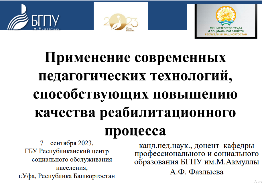07 сентября на площадке Республиканского центра социального обслуживания состоялся республиканский семинар для специалистов реабилитационных центров для детей и подростков с ОВЗ и Серафимовского детского дома-интерната для умственно-отсталых детей. В работе семинара приняла участие доцент кафедры профессионального и социального образования А.Ф.Фазлыева.