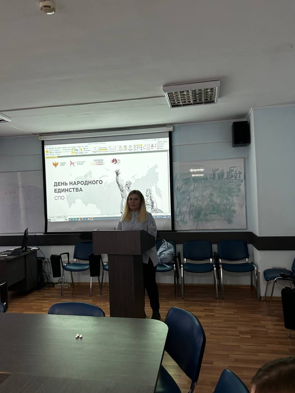 30 октября 2023 года для студентов 1 курса направления подготовки Психолого-педагогическое образование, направленность (профиль) «Психология и социальная педагогика» было проведено мероприятие в рамках Федерального проекта «Разговоры о важном». Тема мероприятия «День народного единства». Мероприятие было подготовлено и проведено Кушпита Полиной студенткой 3 курса направления подготовки Психолого-педагогическое образование, профиль «Психология и социальная педагогика».