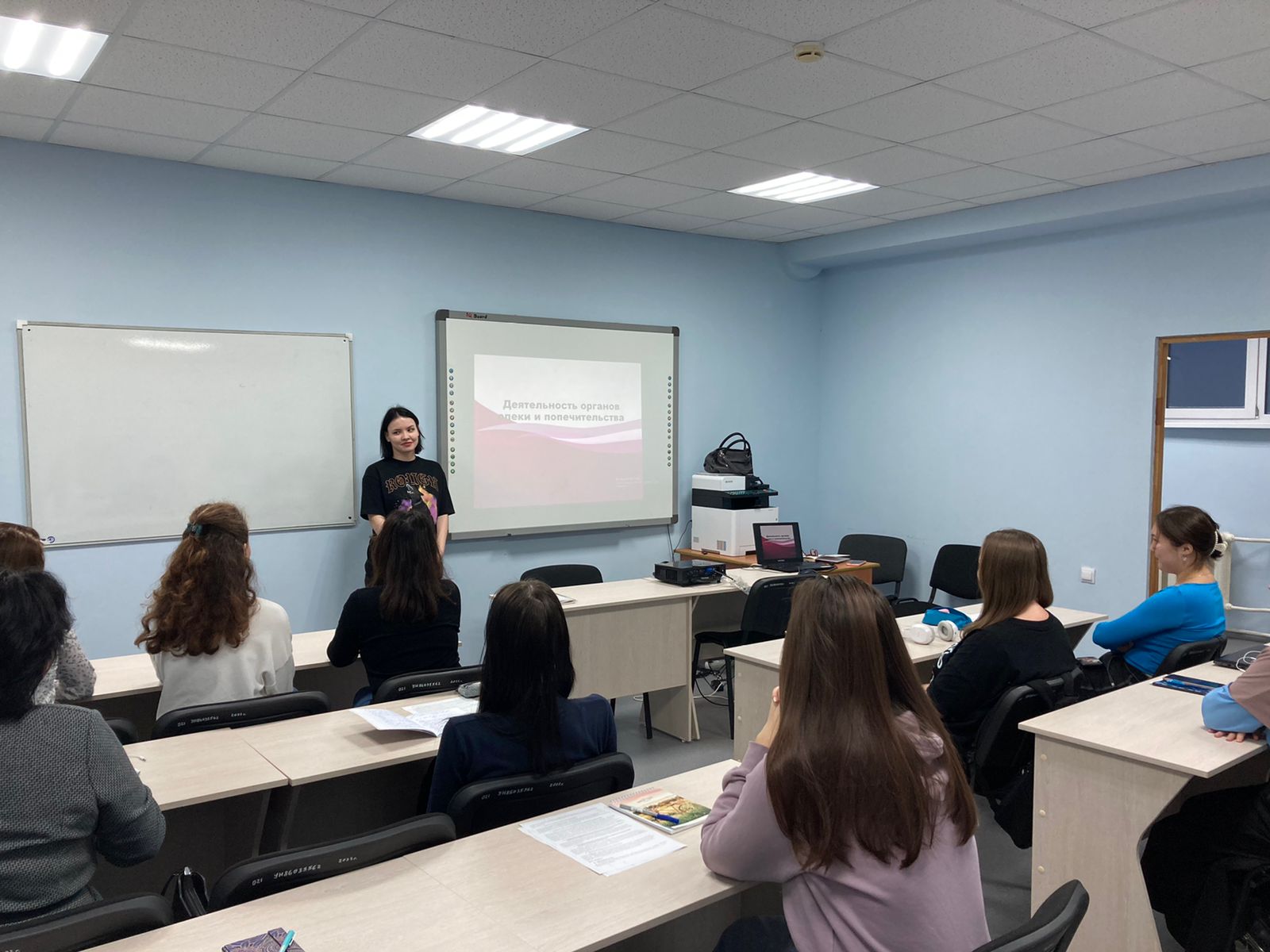 На кафедре профессионального и социального образования студенты 4 курса гр.СР_СЗ-41-20 провели 2 пары со студентами гр.ППОСП-31-21. Первое занятие было практическим, где старшекурсники заслушали ответы на семинарские вопросы студентов по теме: «Организация социально-педагогической деятельности» и поставили соответствующие оценки, второе занятие было лекционным на тему: «Деятельность органов опеки и попечительства».