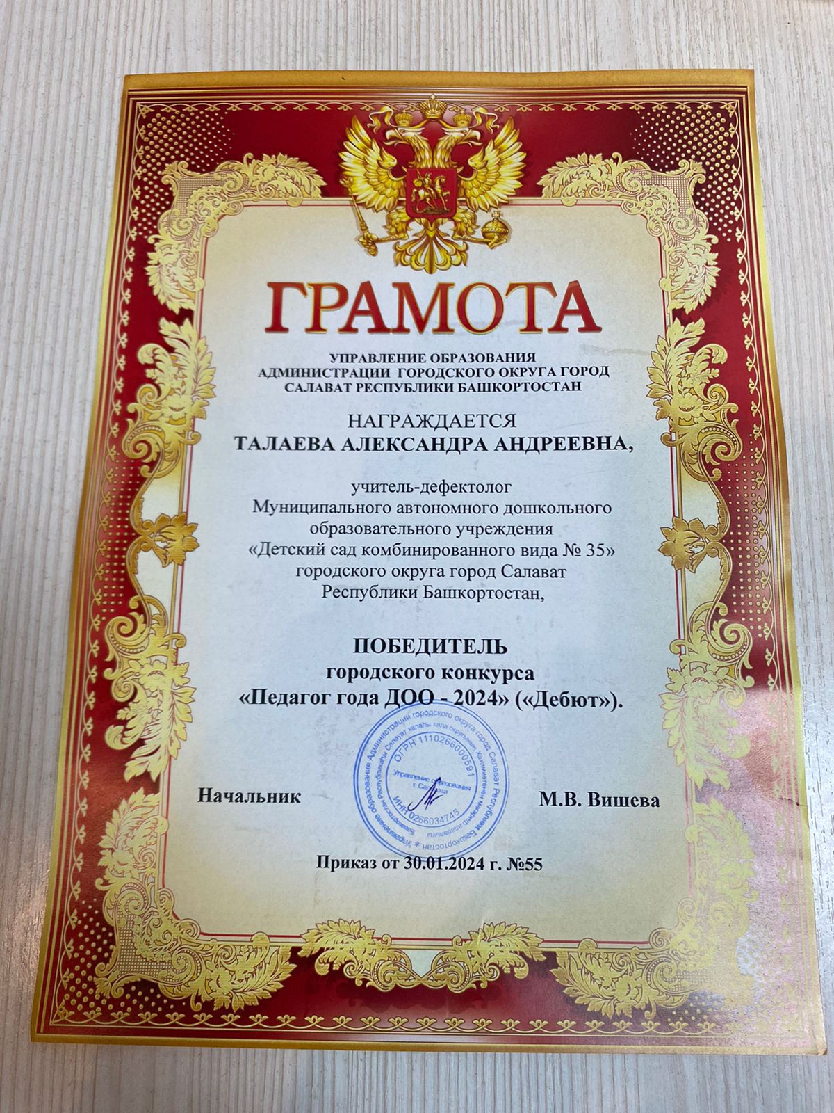 Александра поделилась своими впечатлениями от участия в конкурсе: «Хочется выразить благодарность не только коллективу МАДОУ № 35 г. Салавата, но и преподавателям магистратуры БГПУ им. М. Акмуллы, Кафедре профессионального и социального образования по направлению 44.04.02-Психолого-педагогическое  образование, Направленность (профиль) «Специалист по работе с семьей». Благодаря полученным знаниям и умениям я справилась и победила в городском конкурсе «Педагог года ДОО – 2024» («Дебют»)».