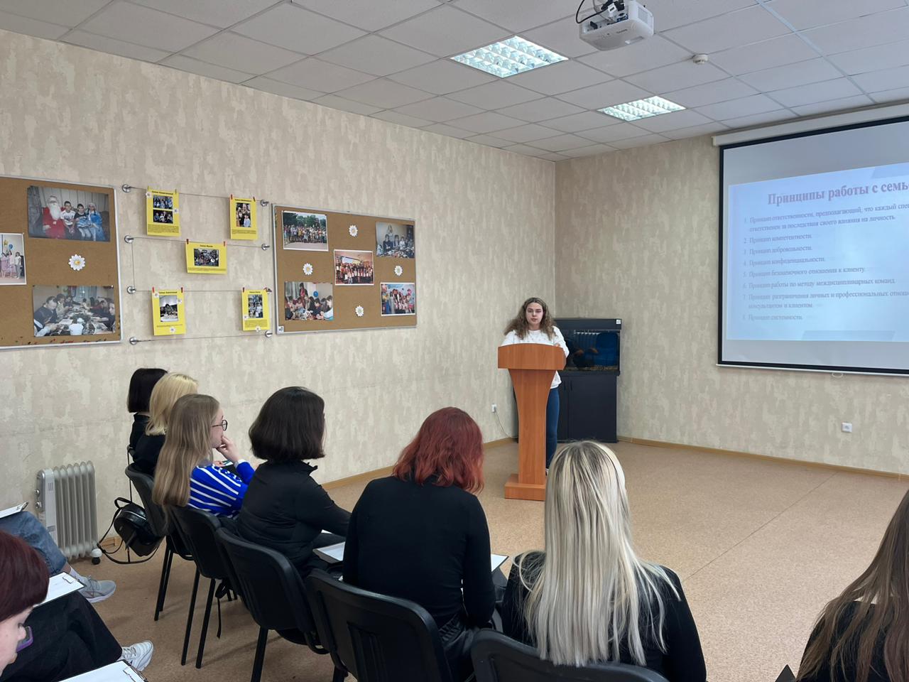 Многолетнее сотрудничество кафедры профессионального и социального образования Института педагогики с МБОУДО ЦППМСП «Семья» позволяет познакомить студентов, находящихся на начальном этапе подготовки к своей будущей профессии  со специалистами центра, имеющими за плечами большой профессиональный опыт. 09 апреля 2024 года студенты первого курса  Института педагогики, направления 44.03.02 – Психолого-педагогическое образование, направленность (профиль) «Психология и социальная педагогика, под руководством старшего преподавателя О.В. Вечкановой посетили семинар «Особенности работы специалистов с замещающими семьями» при МБОУДО ЦППМСП «Семья», на котором был представлен опыт работы с детьми-сиротами и детьми, оставшимися без попечения родителей. Также студенты познакомились с технологией работы по постинтернатному сопровождению выпускников.