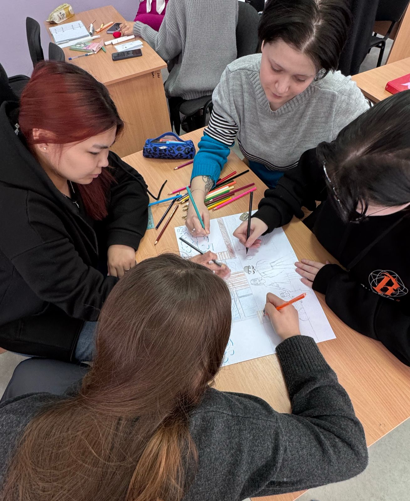 После работы с ассоциациями студенты были разделены на группы. В командах они создали визуальные образы своей идеальной семьи, используя различные материалы для творчества: бумагу, краски, фломастеры и даже элементы коллажа. Этот этап позволил участникам проявить свои креативные способности и совместно обсудить важные для них ценности и традиции. Работая в команде, студенты учились слушать друг друга, находить компромиссы и создавать общий образ, который отражал бы мечты каждого участника.