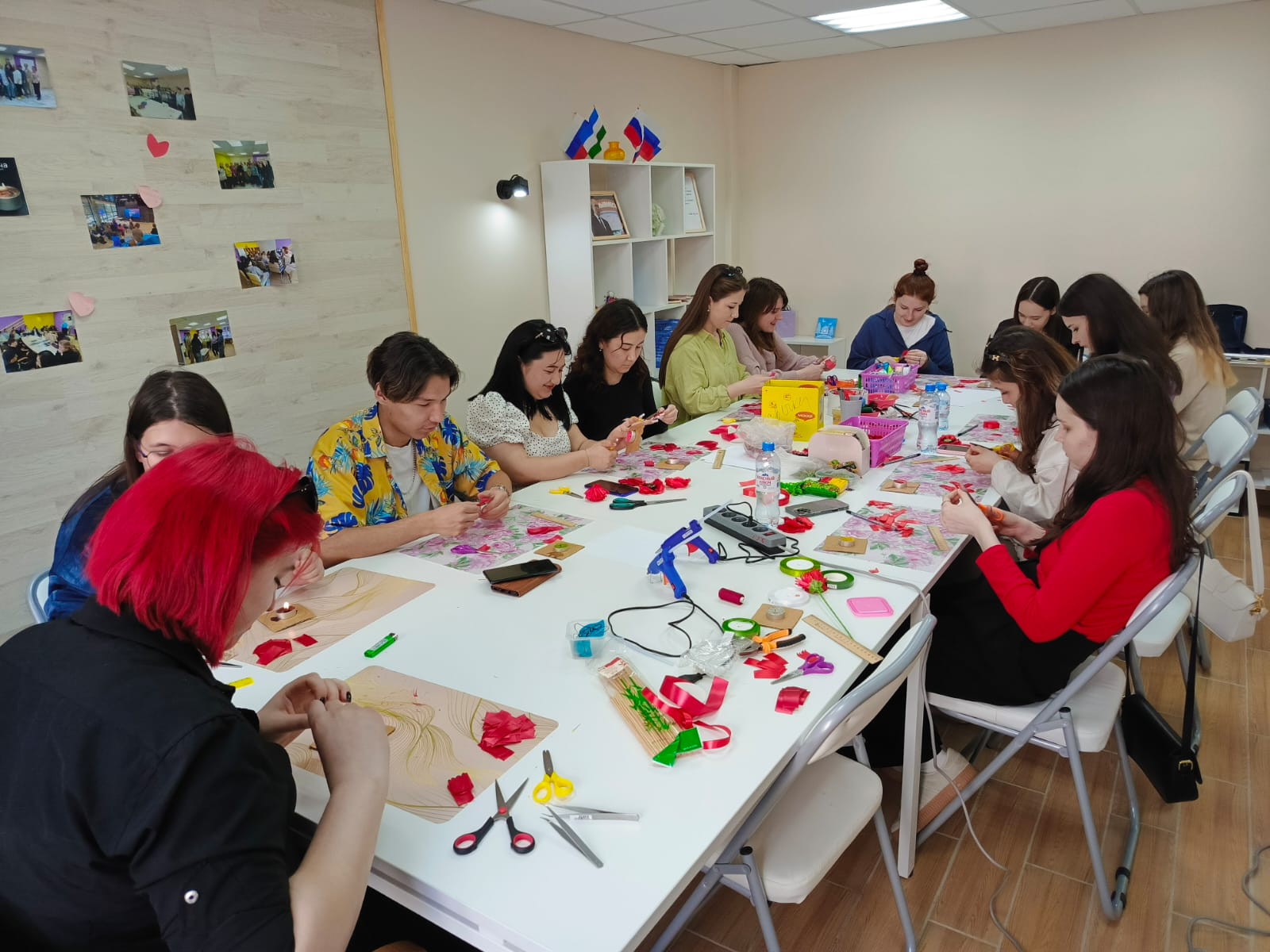 На этот раз студенты собрались в молодежном клубе «Точка притяжения», где вместе с единомышленниками принялись за создание бумажных гвоздик — символа памяти и уважения к героям войны. Работая с крафтовой бумагой, ребята не только проявили свои творческие способности, но и создали атмосферу дружбы и единства.