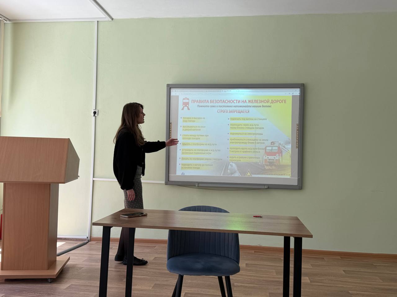 Сегодня прошло ещё одно важное мероприятие для студентов 1 курса направления «Психология и социальная педагогика». Под руководством старшего преподавателя кафедры профессионального и социального образования Вечкановой О.В., была организована беседа, посвященная вопросам безопасности на железной дороге.