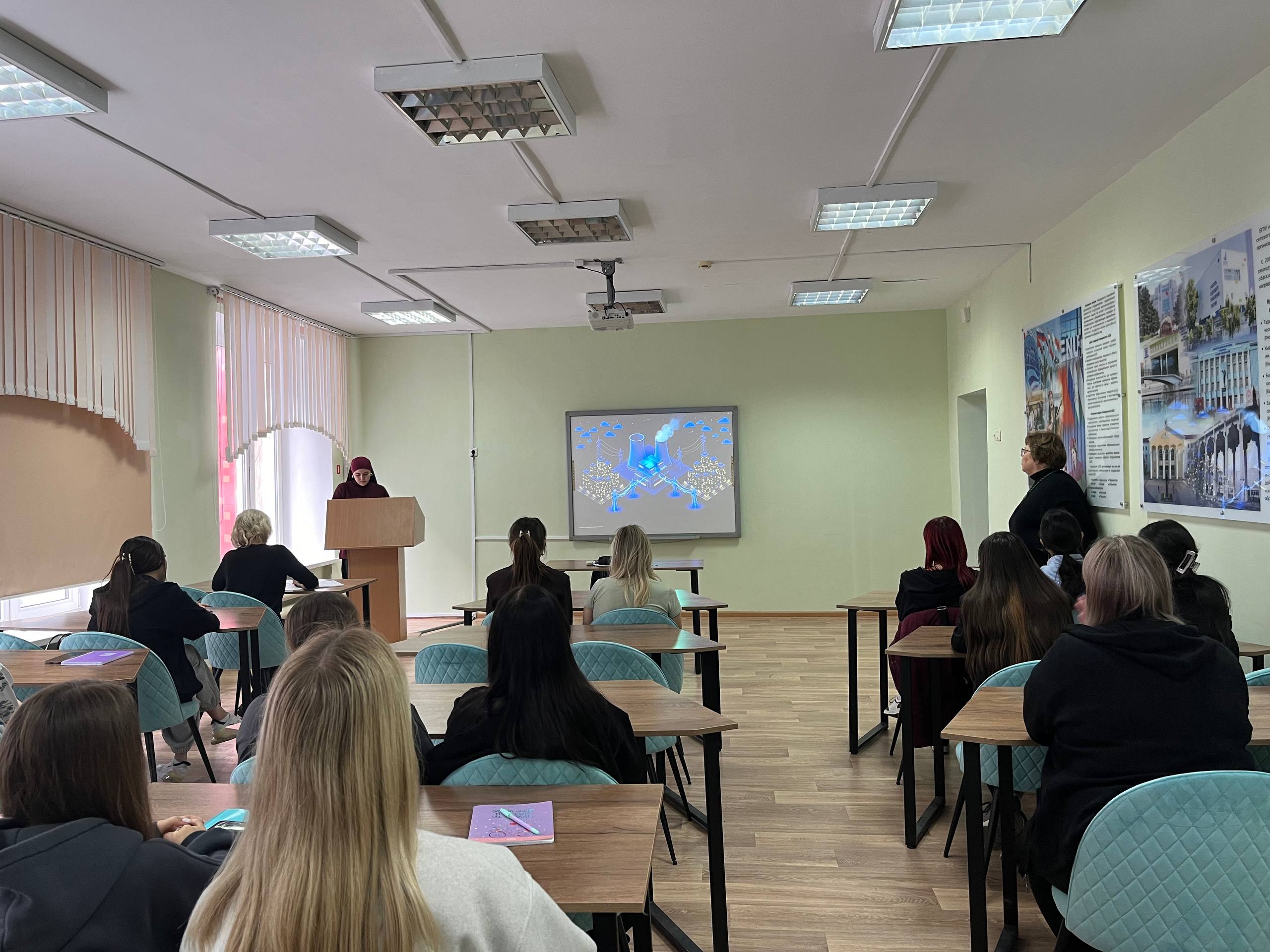 Целью занятия стало формирование чувства гордости за достижения страны в области мирного атома, уважения к ученым и инженерам, а также осознание роли атомной энергии в устойчивом развитии человечества. В ходе интерактивной дискуссии, сопровождавшейся видеоматериалами, студенты погрузились в историю и современные реалии атомной отрасли. Особый акцент был сделан на три ключевых слова, определяющих её масштаб: «гордость», «вдохновение» и «мечта». В процессе беседы обучающимся были заданы вопросы о роли госкорпорации «Росатом» как технологического лидера, а также о применении атомных технологий в различных сферах жизни. Студенты активно и уверенно отвечали, демонстрируя понимание значимости мирного атома для развития науки и улучшения качества жизни людей.