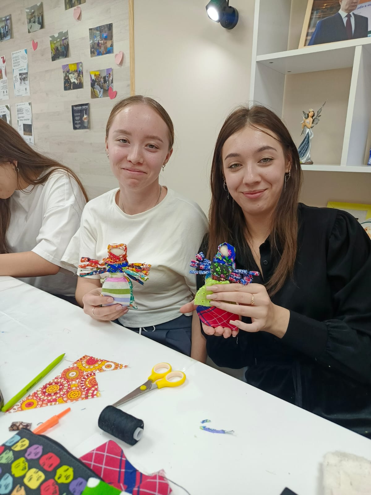 Главным событием стала практическая часть — создание традиционной народной куклы-оберега Десятиручки. Эта кукла, как гласит поверье, помогала хозяйке во всех делах: рукоделии, готовке, уборке и заботе о семье. Десять рук символизируют помощь в десяти главных женских делах, чтобы все спорилось и успевалось.
