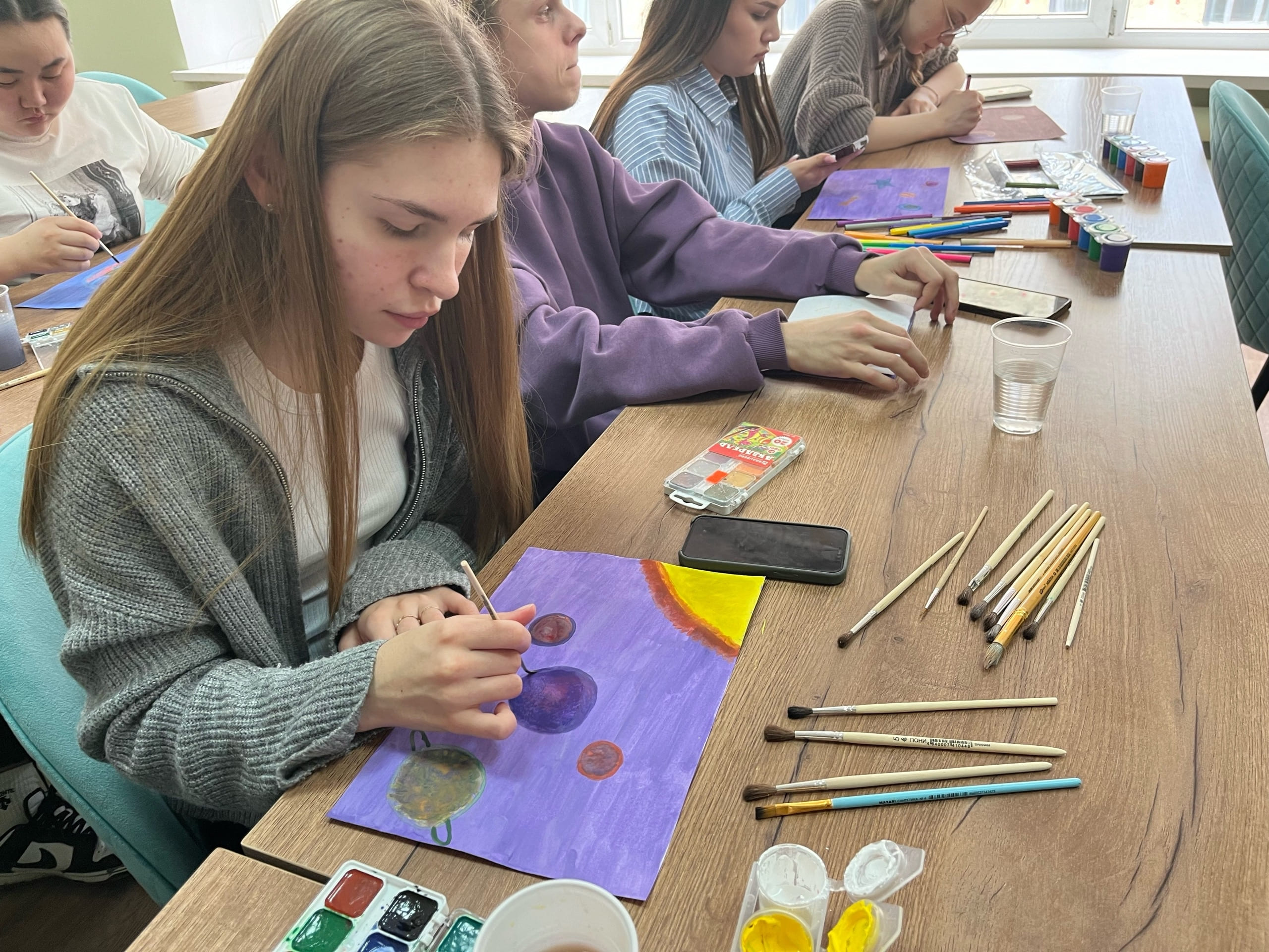 Кульминацией встречи стала арт-терапевтическая практика. Под звуки успокаивающей мелодии студенты рисовали космос на заранее затонированных листах «Карты внутреннего космоса». Тонированный фон помог ребятам расслабиться и выразить не столько «правильную» галактику, сколько свое личное, эмоциональное восприятие темы. Каждый рисунок стал искренним отражением того, что происходит внутри автора