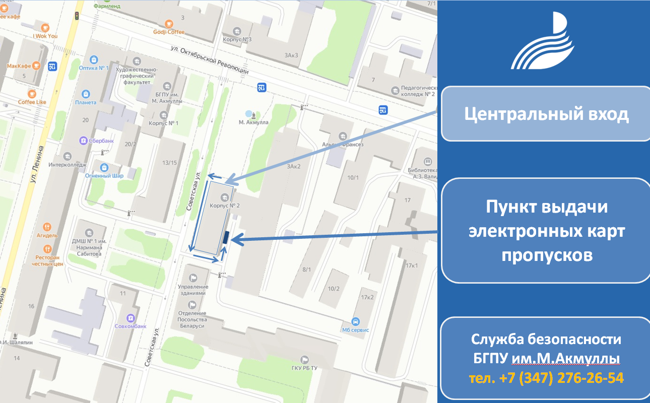 Пункт выдачи пропусков находится за 2 учебным корпусом. Нужно обойти 2 учебный корпус справа по ул. Советской, повернуть налево, пройти через калитку и еще раз повернуть налево. Схема прилагается.