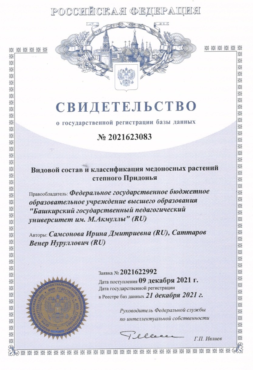 Получено свидетельство о государственной регистрации Базы данных «Видовой состав и классификация медоносных растений степного Придонья». Авторы: Самсонова И.Д., Саттаров В.Н.