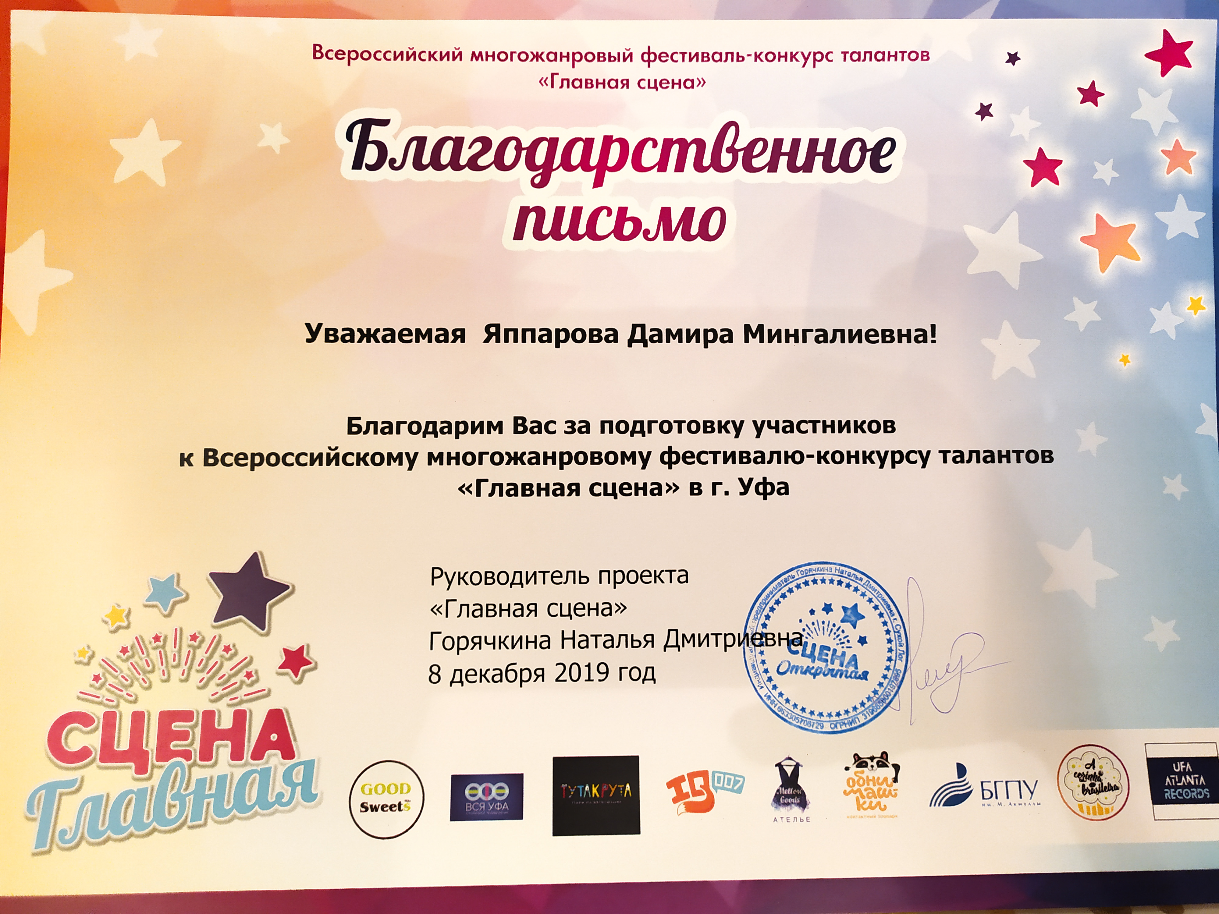 8 декабря в ГКДЦ состоялся Всероссийский многожанровый фестиваль-конкурс талантов "Главная сцена". Это уникальный проект, с открытой системой судейства, который проводится на профессиональных площадках. Марсель Закиров, студент первого курса, профиля "Музыкальное образование" (класс старшего преподавателя Д.М.Яппаровой) получил Гран-при в номинации "Вокальное искусство". Поздравляем Марселя с победой!