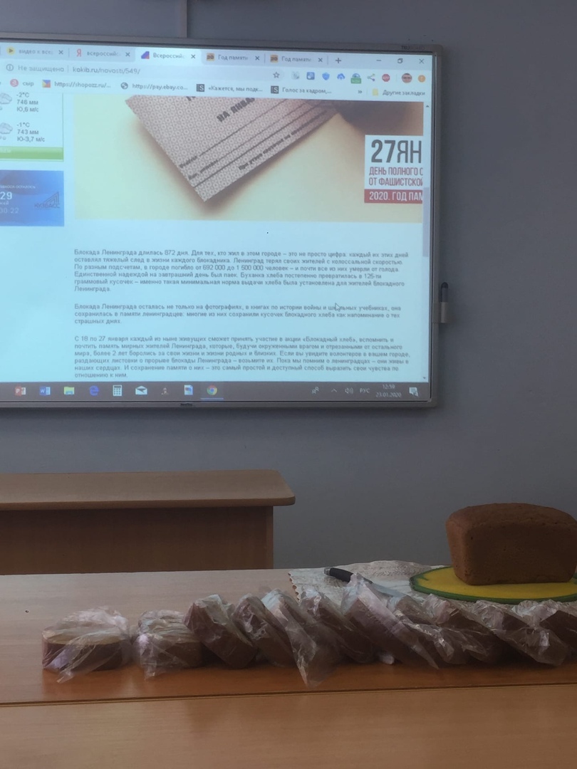 С 18 января 2020 года по 27 января 2020 года проводится всероссийская акция " Блокадный хлеб". Основной целью акции является сохранение памяти о страшных годах войны и о той трагедии, которая настигла ленинградцев в те года. Символом акции станет кусок хлеба весом в 125 грамм - именно столько полагалось в день жителям блокадного Ленинграда. Это паёк является символом стойкости и мужества жителей города, окружённого фашистами.
