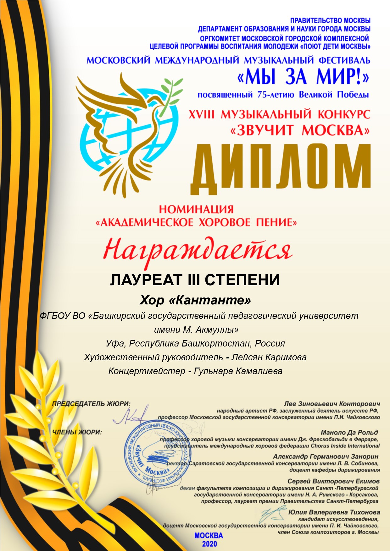 Хор «КАНТАНТЕ» БГПУ им.М.Акмуллы стал лауреатом XVIII Московского международного детско-юношеского музыкального конкурса «Звучит Москва».