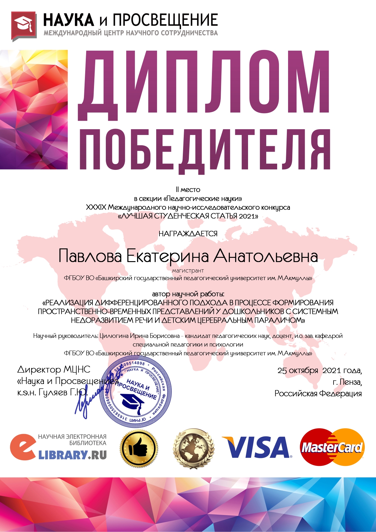 Павлова Екатерина под научным руководством и.о. зав. кафедрой специальной педагогики и психологии, канд. пед. наук Цилюгиной Ирины Борисовны представила научную статью на тему «Реализация дифференцированного подхода в процессе формирования пространственно-временных представлений у дошкольников с системным недоразвитием речи и детским церебральным параличом». Компетентное жюри конкурса по достоинству оценило исследование магистранта. Научная работа Павловой Е.А. заняла 2 место в секции «Педагогические науки».