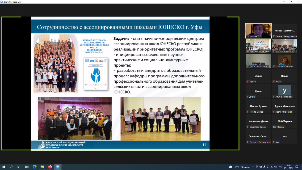 25 ноября в 10.25 в дистанционном формате на платформе Zoom состоялась интерактивная лекция для старшеклассников «ЮНЕСКО образование в современном мире», посвященная 76 годовщине ЮНЕСКО.  В обсуждение данного вопроса принимали активное участие старшеклассники, учителя, директора следующих образовательных организаций: МБОУ школа №45 с углубленным изучением отдельных предметов», МБОУ СОШ №131, МБОУ  школа  № 34, МБОУ школа №80.