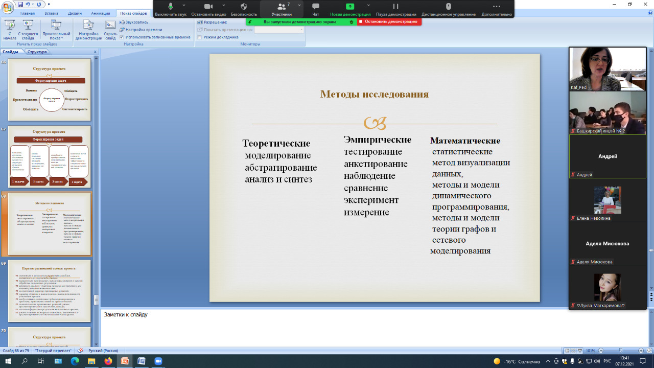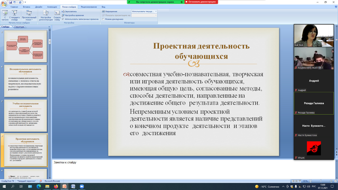 7 декабря 2021 года в 12.45 в рамках профориентационной работы  в дистанционном формате на официальном сайте  БГПУ  им. М. Акмуллы  был проведен мастер-класс на тему «Организация проектной деятельности обучающихся». В данном мероприятии приняли участие педагоги и старшеклассники психолого-педагогических классов МБОУ «Башкирский лицей №2», МБОУ СОШ №127, МБОУ СОШ №1 с. Архангельское. Кандидат педагогических наук, доцент кафедры педагогики Нуриханова Наиля Камиловна раскрыла теоретические и практические аспекты изучаемого вопроса, предложила практико-ориентированные задания, провела анализ проектных работ обучающихся по предметам, а также осветила основные направления профессиональной подготовки вуза. Участникам мастер-класса были предложены методические рекомендации по организации экспериментальной работы на базе БГПУ им. М.Акмуллы под руководством профессорско-преподавательского состава. Лектор в своем выступлении обратил внимание участников на взаимосвязь «школа-вуз».