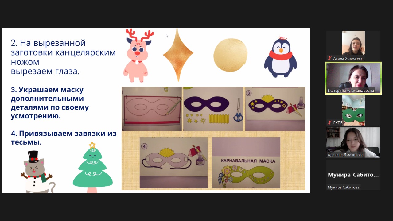 22 декабря 2021 г. для маленьких пациентов Республиканской клинической психиатрической больницы волонтеры отряда «Палитра», студенты 1 курса направления «Начальное образование» БГПУ им. М. Акмуллы Аделина Джалилова и Алина Ходжаева, под рук. доцента кафедры ТиМНО, руководителя студенческого волонтерского отряда «Палитра», «серебряного» волонтера Екатерины Савельевой, провели творческое занятие онлайн «Новогодние маски». Волонтеры с помощью презентации познакомили участников мероприятия с историей появления масок и изготовили маски для новогоднего праздника, даже с применением страусиных перьев!