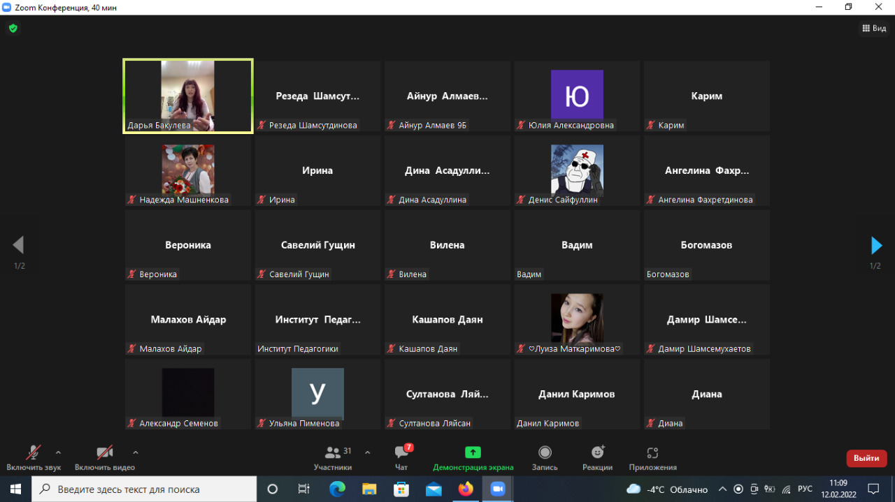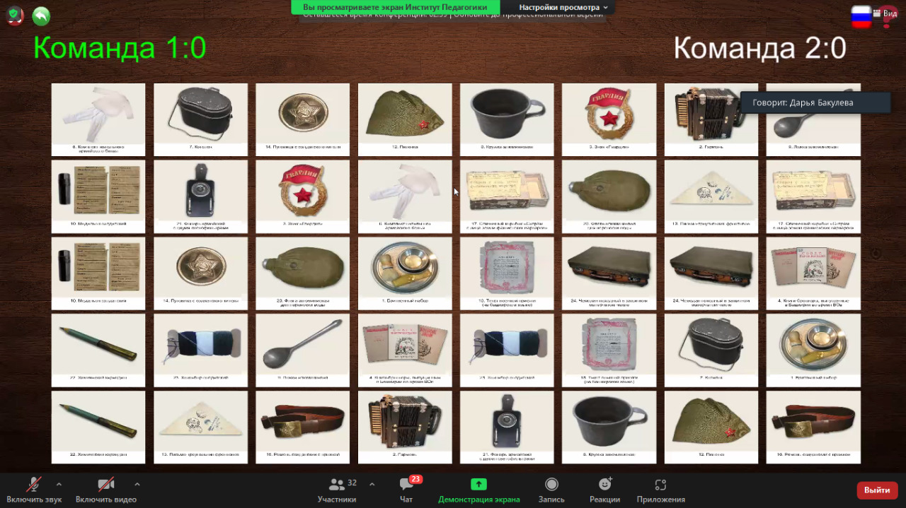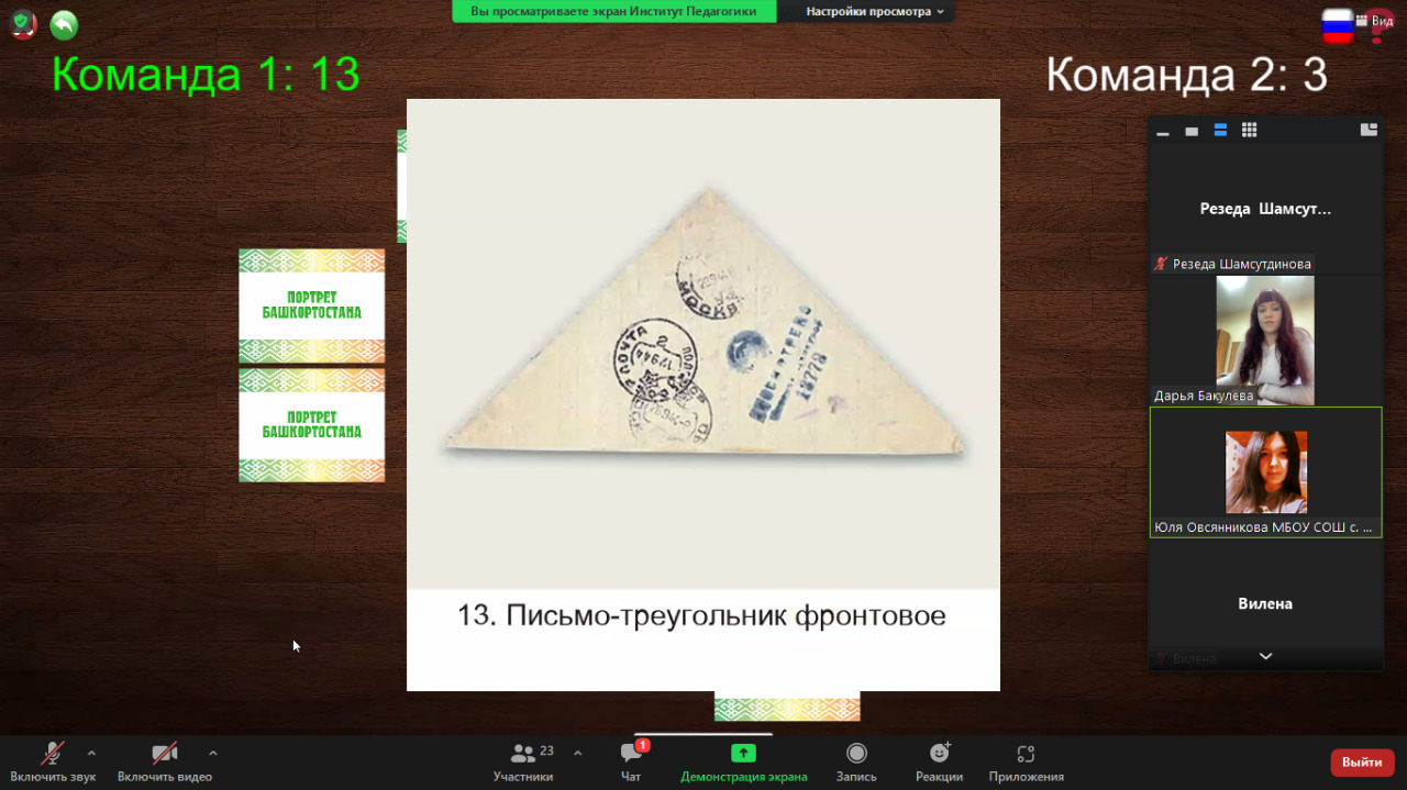 В преддверии военно-патриотического праздника «День защитника Отечества», 13 февраля 2022г., со школьниками психолого-педагогических классов МБОУ «Школа №113 им. И. И. Рыбалко», МОБУ СОШ №1 с. Архангельское, сетевого педагогического класса Хайбуллинского района при МАОУ СОШ №1 с.Акьяр, кафедра педагогики и магистрант 1 курса направление «Педагогическое образование» направленность (профиль) «Менеджмент в образовании», волонтер отряда «Палитра» Бакулева Дарья Андреевна (наставник проекта Екатерина Савельева, «серебряный» волонтер, доцент кафедры теорий и методик начального образования БГПУ им. М. Акмуллы), организовали и провели военно-патриотическую игру-лото «Предметы личного пользования солдат и офицеров Великой Отечественной войны» в формате Zoom. Школьники прониклись темой мероприятия, проявляли познавательную активность и делились эмоциями, научились складывать письмо треугольник фронтовое.