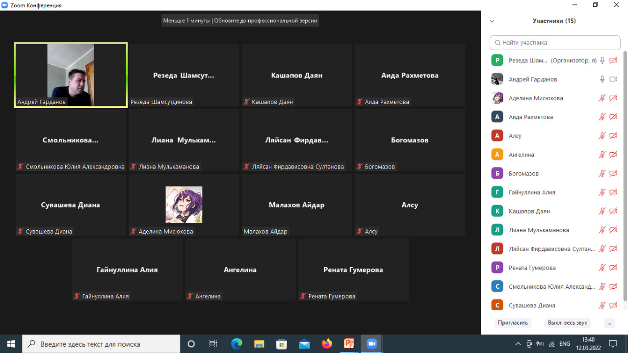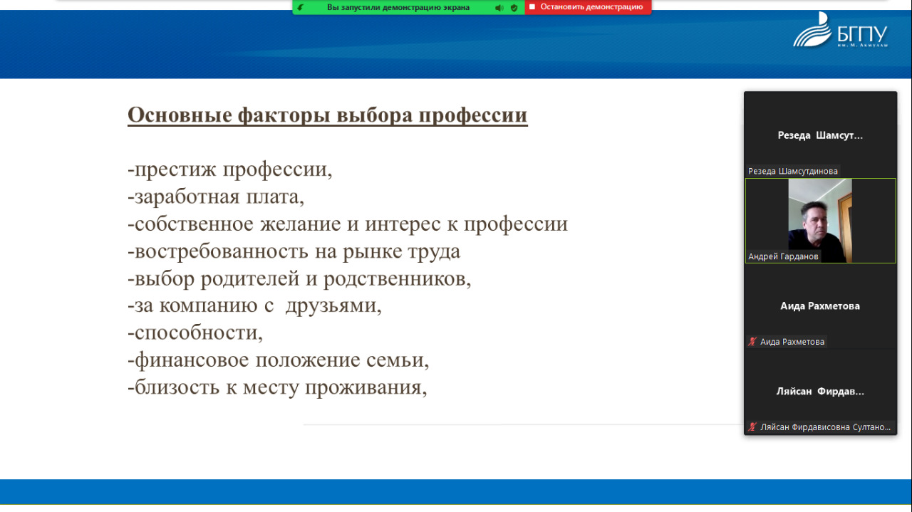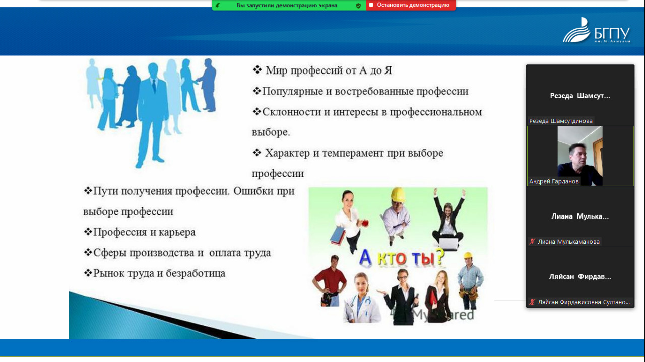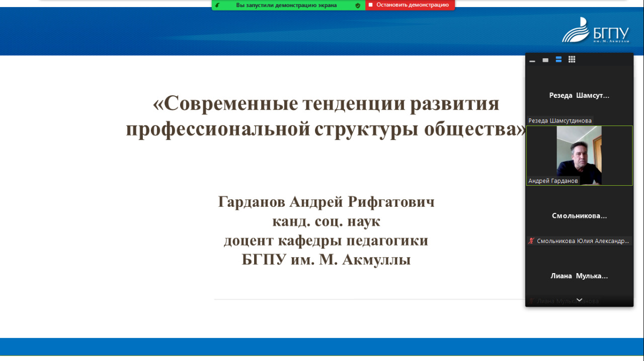 12 марта 2022 г. на базе кафедры педагогики состоялась онлайн-лекция для обучающихся психолого-педагогических классов (МБОУ «Школа №113 им. И. И. Рыбалко» ГО г.Уфа, МОБУ СОШ №1 с. Архангельское, сетевой педагогический класс Хайбуллинского района при МАОУ СОШ №1 с.Акьяр, МБОУ «Башкирский лицей №2» ГО г.Уфа) на тему: «Современные тенденции развития профессиональной структуры общества». Кандидат социологических наук, доцент кафедры педагогики Гарданов Андрей Рифгатович представил некоторые современные особенности и тенденции развития профессиональной структуры российского общества, статистические данные по рынку труда, рассказал о роли педагогической профессии в современном мире и будущем, а также дал практические рекомендации по выбору профессии в соответствии с психологическим типом личности выпускника.