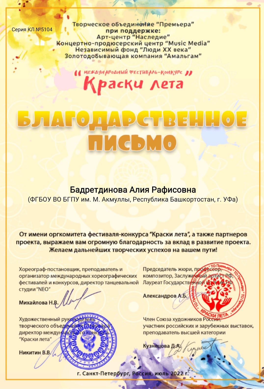 Студентка 2 курса кафедры музыкального и хореографического образования БГПУ им. М. Акмуллы  Куликова Ульяна вошла в число победителей Международного фестиваля-конкурса «Краски лета».