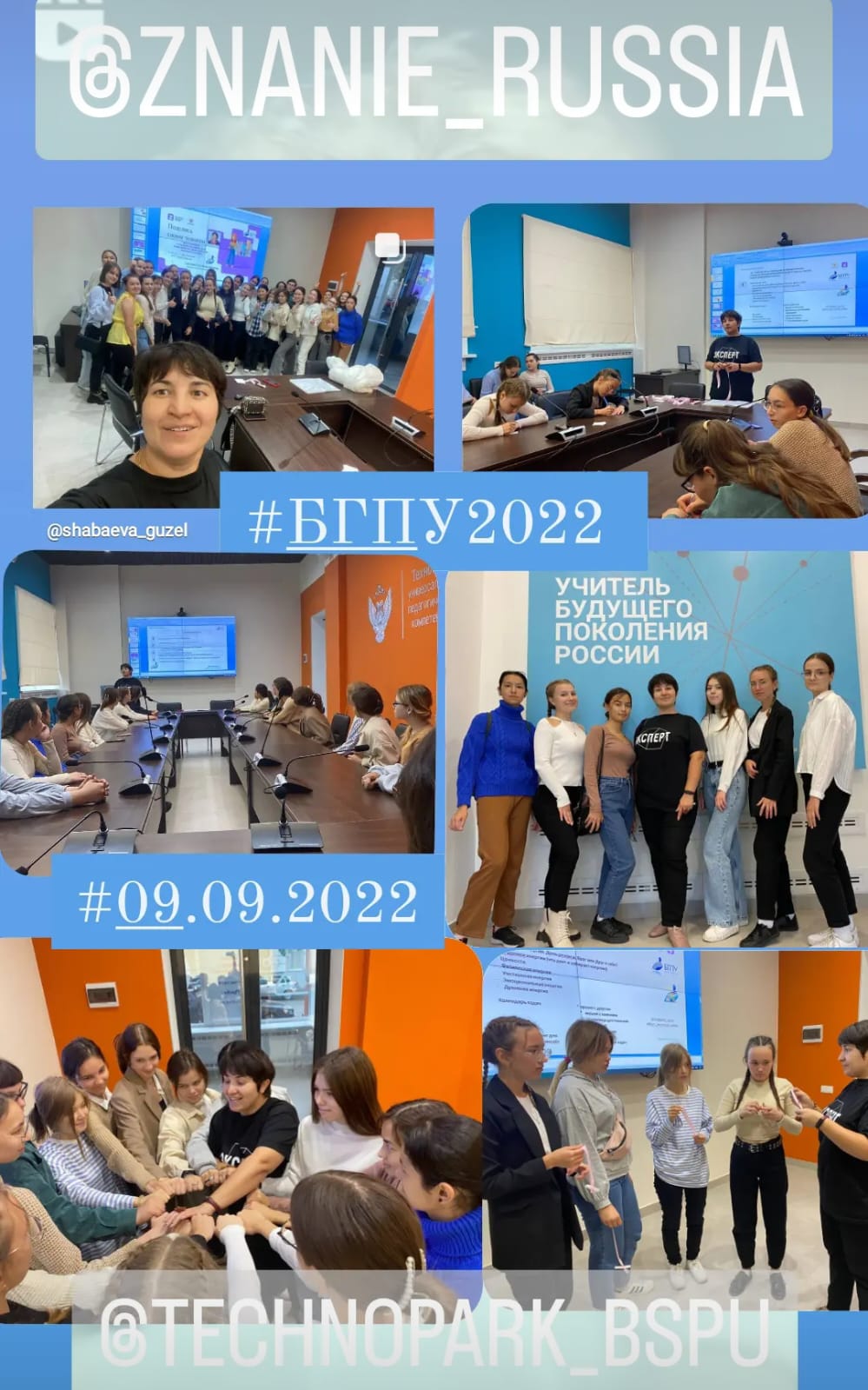 09.09.2022 Шабаева Гузель Фагимовна кандидат педагогических наук, доцент БГПУ им.И.Акмуллы успешно организовала СТУДЕНЧЕСКИЙ  МАСТЕРМАЙНД в рамках  просветительских акций для молодежи «ПОДЕЛИСЬ СВОИМ ЗНАНИЕМ», организуемая Российским обществом «ЗНАНИЕ» совместно с Минпросвещения и Минобрнауки России. Акмуллинский университет присоединился к акции «ПОДЕЛИСЬ СВОИМ ЗНАНИЕМ». С 1 по 9 сентября в России проходит одна из крупнейших просветительских акций для молодежи «Поделись своим Знанием», организуемая Российским обществом «Знание» совместно с Минпросвещения и Минобрнауки России. Площадками выступают аудитории образовательных организаций, музеи, галереи, парки, библиотеки и другие локации. Среди спикеров – учёные, историки, государственные и общественные деятели, специалисты сферы культуры и спорта, представители коммерческого сектора и иные эксперты, являющиеся носителями актуальных знаний. Акмуллинский университет второй раз выступает одной из площадок Всероссийской просветительской акции. В течение недели на базе межфакультетского технопарка универсальных педагогических компетенций «Учитель будущего поколения России» прошли лекции, слушателями которых выступили студенты БГПУ им. М. Акмуллы, а также школьники Уфы, обучающиеся в психолого-педагогических классах. Первый проректор по стратегическому развитию Алмаз Мустаев приветствовал участников акции и подчеркнул важность просветительской деятельности: «Мы вместе с вами открываем цикл просветительских лекций в рамках Всероссийского проекта «Поделись своим Знанием». Просветительской деятельности в нашей стране последние несколько лет уделяется очень большое внимание. А ведь она, по сути, составляет важную часть работы учителя, которую не заменят ни роботы, ни компьютеры. Передача знаний от человека к человеку будет существовать всегда», – отметил Алмаз Флюрович.