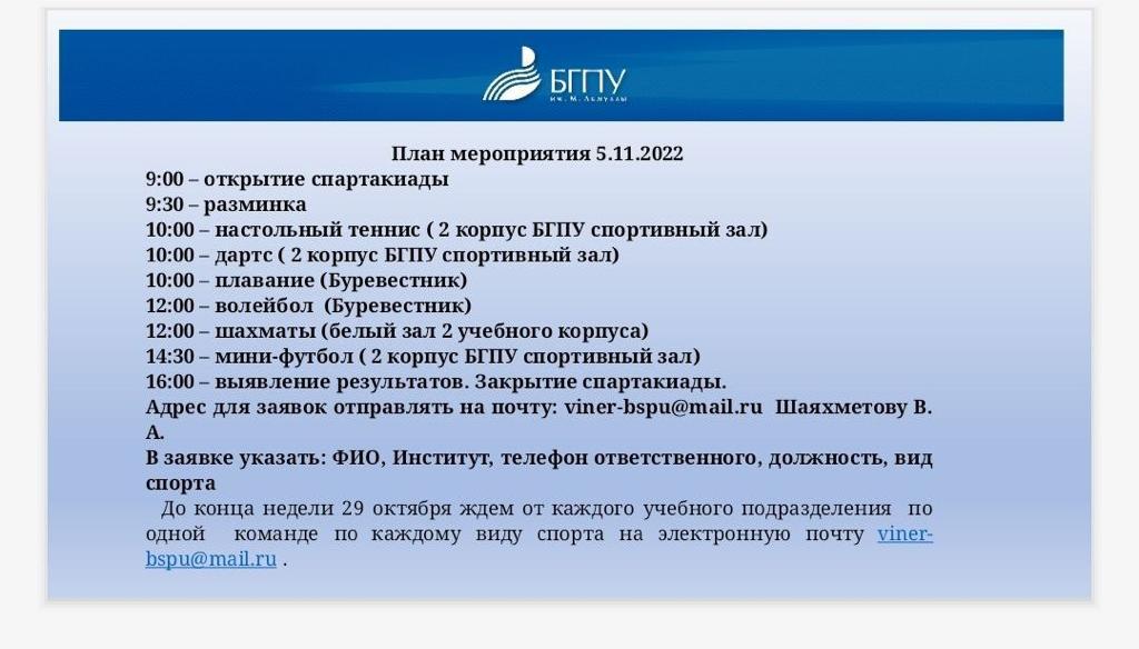 5 ноября 2022 года преподаватели Института педагогики приняли участие в  спартакиаде  сотрудников Акмуллинского университета.