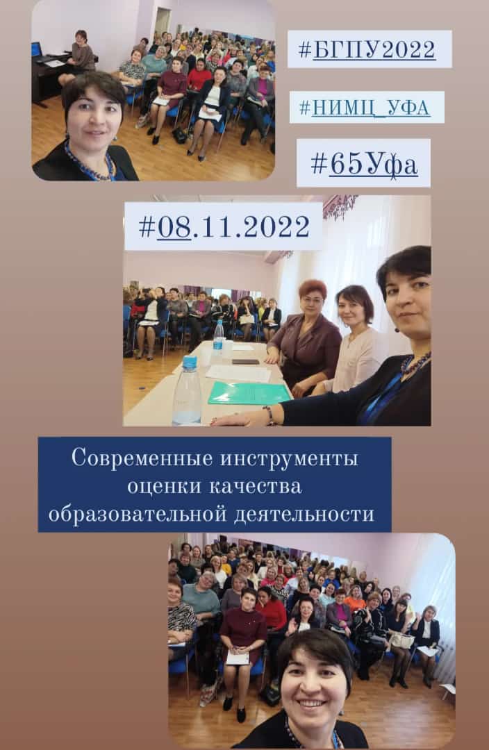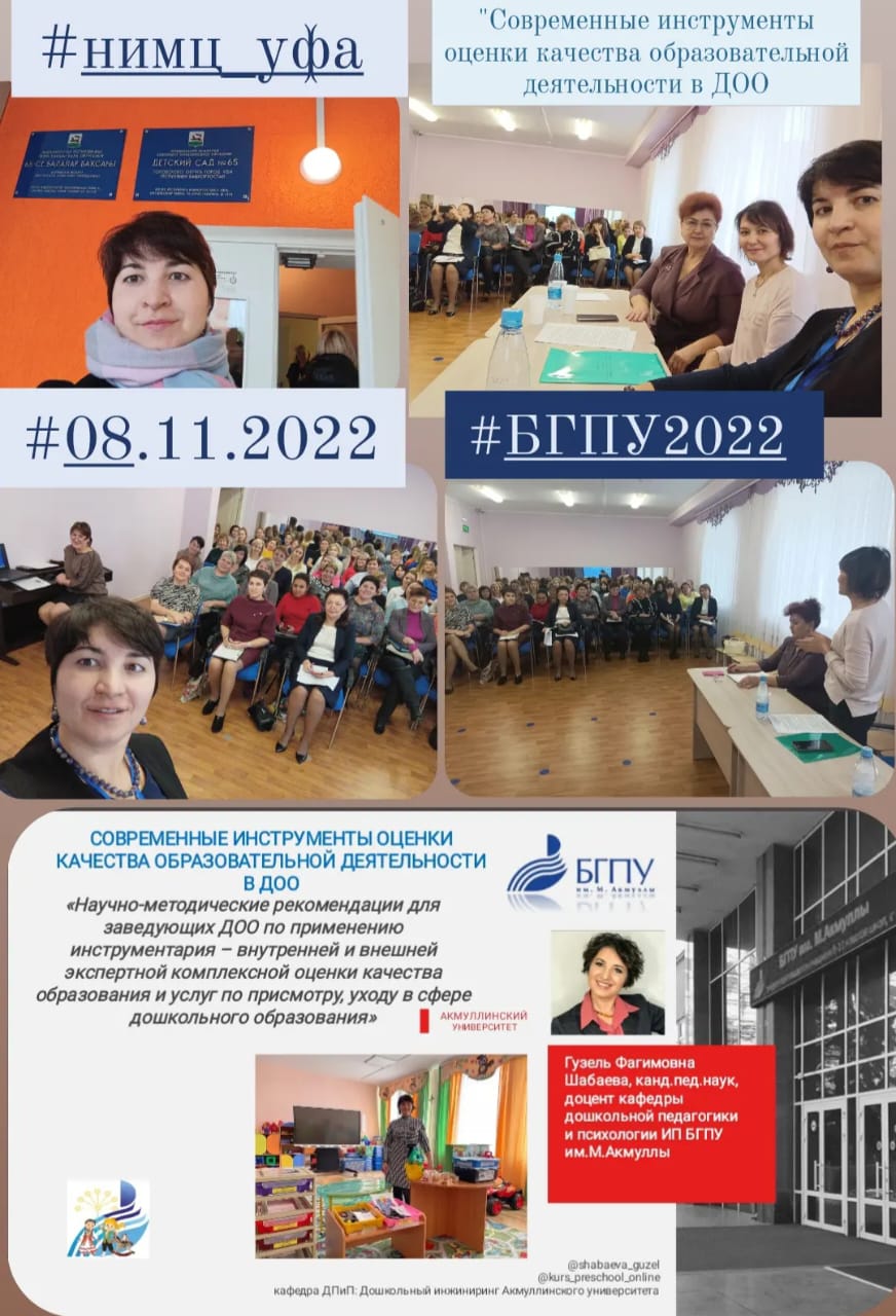 08.11.2022 Шабаева Гузель Фагимовна, к.п.н., доц. провела  профориентационную работу с педагогами г.Уфа РБ ;  выступила перед заведующими ДОО города Уфы на тему:   "Научно-методические рекомендации для заведующих ДОО по применению инструментария  внутренней и внешней экспертной комплексной оценки качества образования и услуг по присмотру, уходу в сфере дошкольного образования в рамках сотрудничества ФГБОУ ВО БГПУ имени М.Акмуллы и НИМЦ организовали на базе МБДОУ Детский сад № 65 г. Уфа РБ в рамках научно-методического семинара Муниципальное бюджетное образовательное учреждение дополнительного образования «Научно-информационно-методический центр» городского округа город Уфа Республики Башкортостан, зав. отделом дошкольного образования  Гоголева Г.М. семинар  по теме "Современные инструменты оценки качества образовательной деятельности в ДОО".