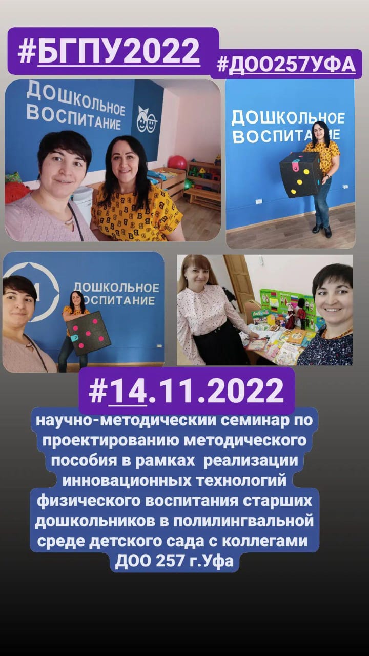 14.11.2022г. к.п.н., доцент Шабаева Гузель Фагимовна провела научно-методический семинар по проектированию методического пособия в рамках  реализации инновационных технологий физического воспитания старших дошкольников в полилингвальной среде детского сада с коллегами ДОО 257 г.Уфа