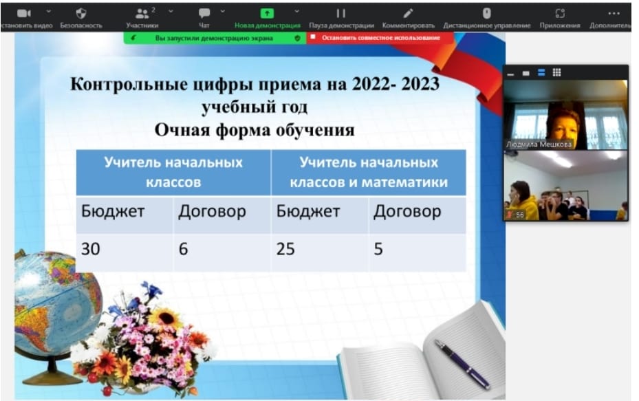 В рамках профориентационной работы кафедры Теорий и методик начального образования Института педагогики 14.11.2022 г. и 15.11.2022 г. были проведены встречи в дистанционном формате с учащимися МОБУ СОШ с. Кашкино Аскинский район РБ, учащимися МОБУ СОШ с. Новый Зирган Хайбуллинский район РБ и учащимися МБОУ «СОШ №13» ГО г. Октябрьский РБ. Приняли участие более 56 учащихся. Организовала  встречи к.п.н., доцент кафедры ТиМНО Мешкова Л.М..  В результате встречи, учащиеся познакомились с направлениями подготовки педвуза в целом, с направлениями подготовки кафедры ТиМНО ИП БГПУ им. М. Акмуллы «Начальное образование», «Начальное образование и учитель математики», учащиеся ознакомились с правилами и сроками поступления на очную и заочную форму обучения в БГПУ им. М. Акмуллы.