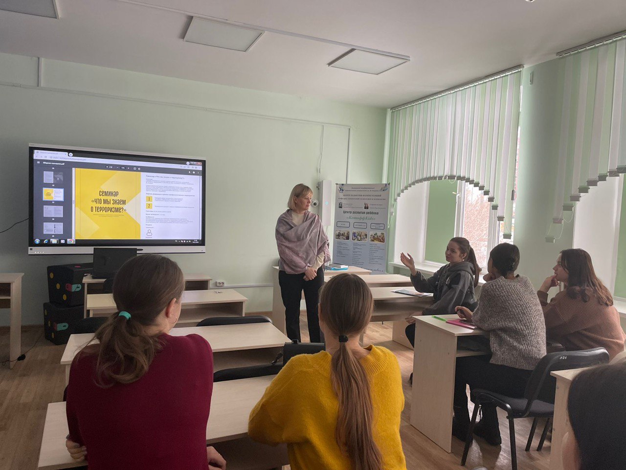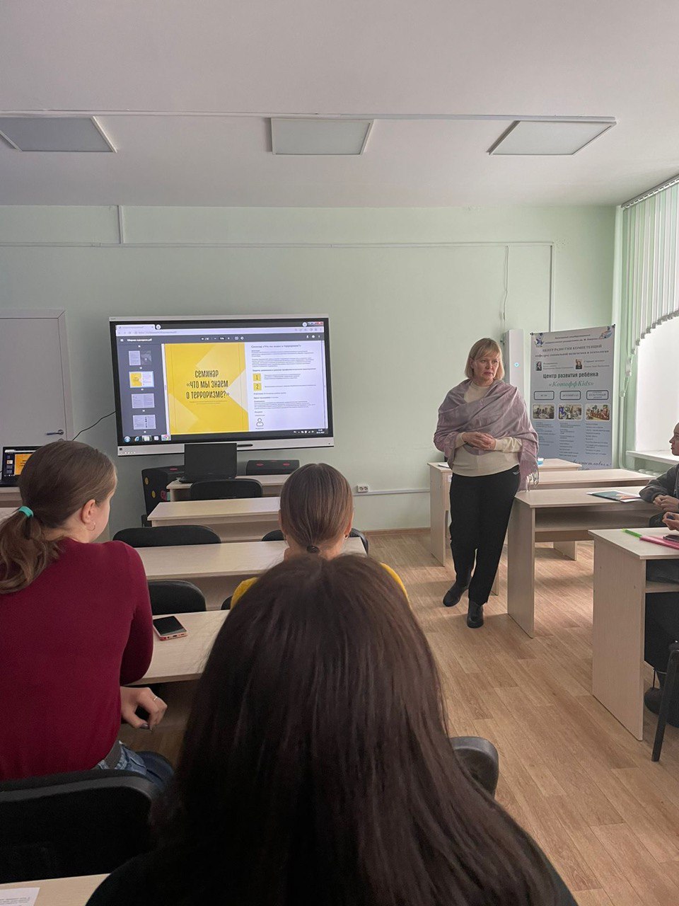 На кафедре Дошкольной педагогики и психологии состоялся кураторский час, посвященный теме: «Что мы знаем о терроризме?», приуроченный к памятной дате Дня солидарности в борьбе с терроризмом. В диалоге со студентами обсуждали глобальные темы, анализировали содержательную часть основных информационных позиций кураторского часа.