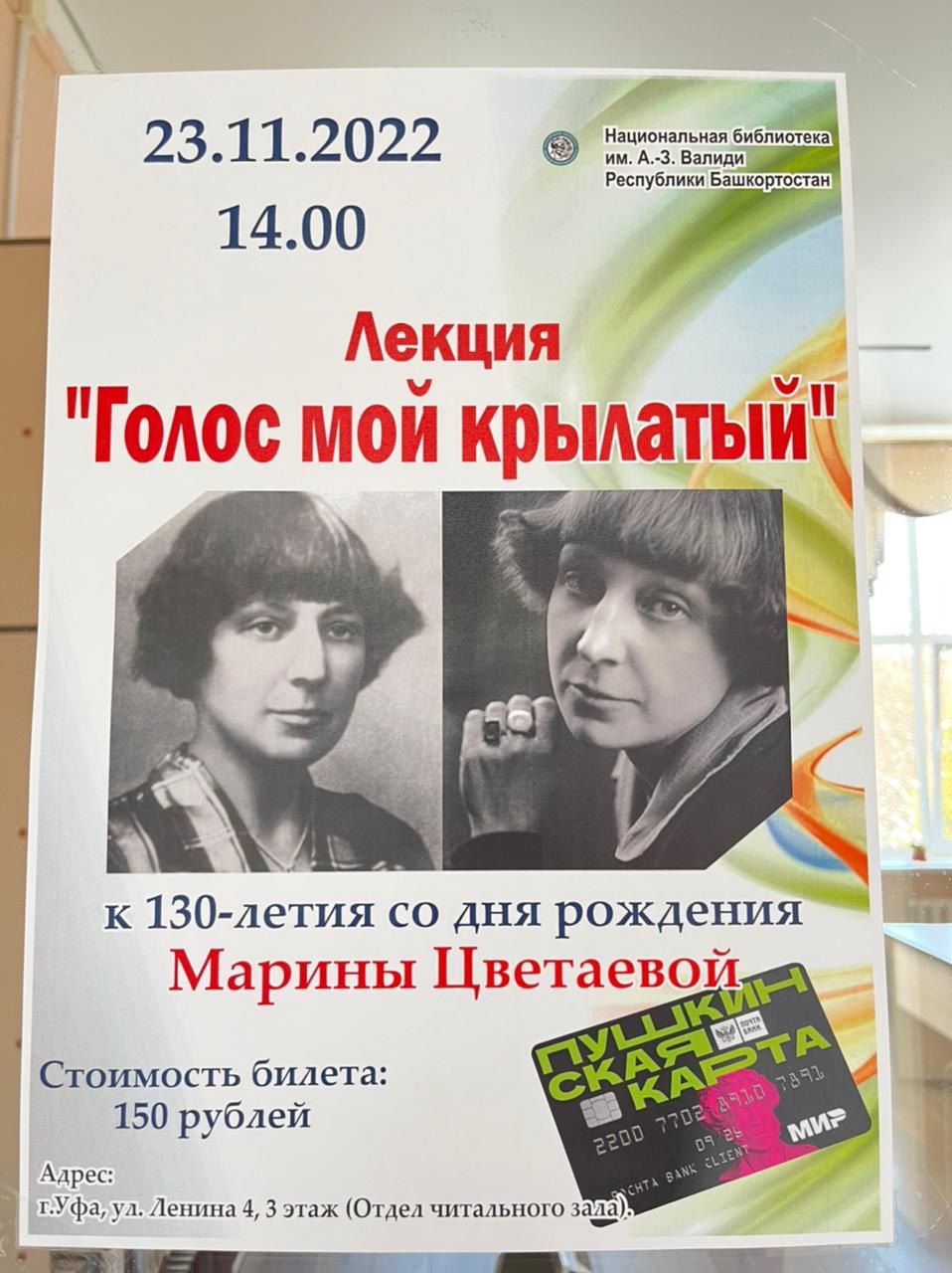 23 ноября 2022 студенты ПО_ДО-31-20, ПО_ДО- 41-19 и ст. преподаватель кафедры ДПиП Пилипенко Е.А. посетили открытую лекцию в национальной библиотеке З. Валиди, посвященную творчеству М. Цветаевой.