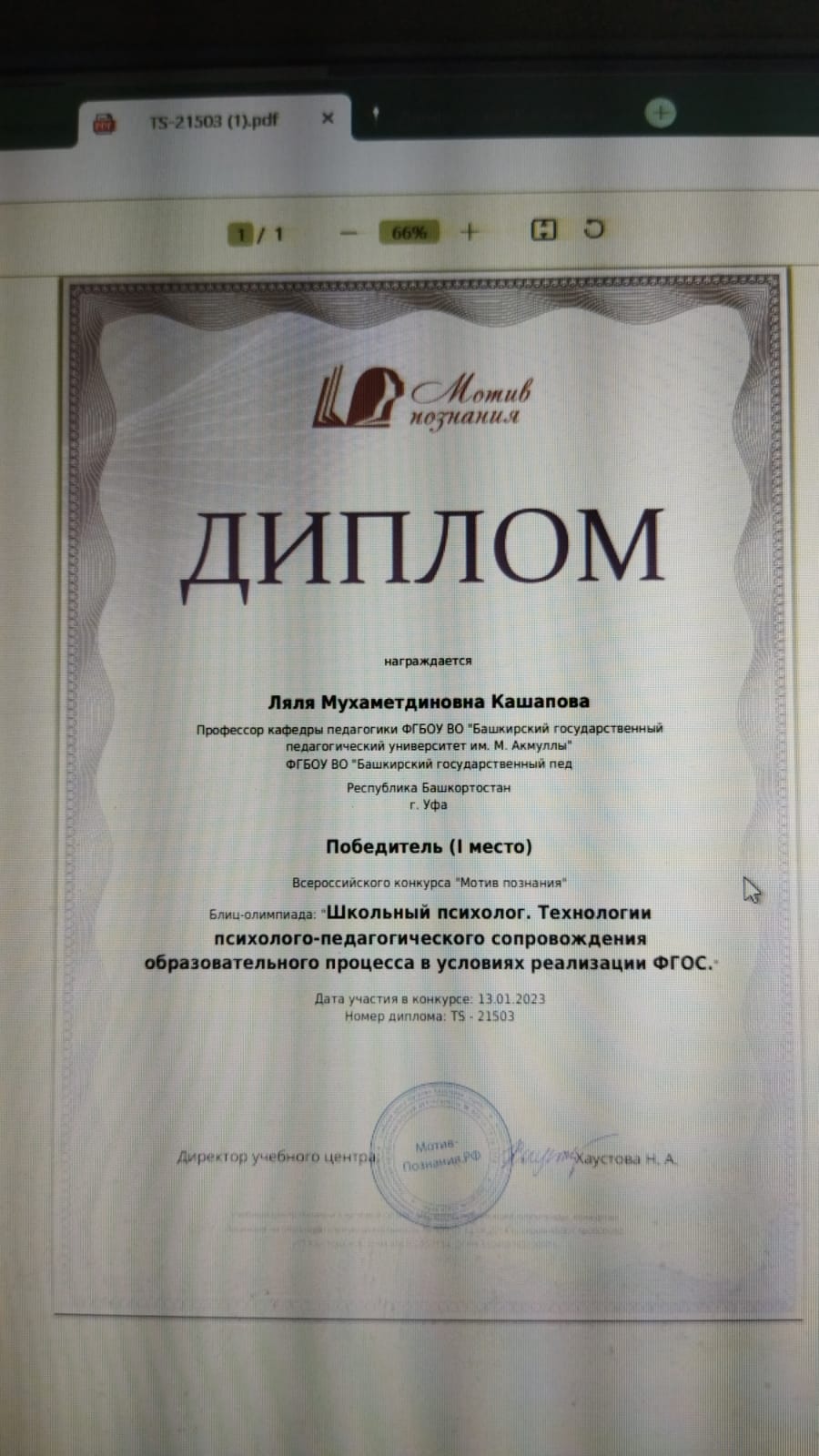 13 января 2023 г. профессор кафедры педагогики Кашапова Ляля Мухаметдиновна  победила (1 место) во всероссийском конкурсе "Мотив познания", Блиц-олимпиада: "Школьный психолог. Технологии психолого-педагогического сопровождения образовательного процесса в условиях реализации ФГОС.