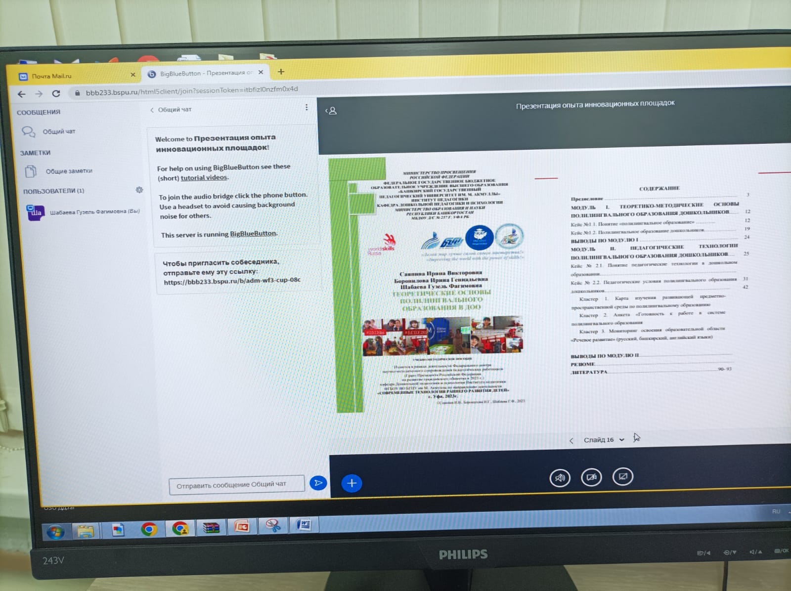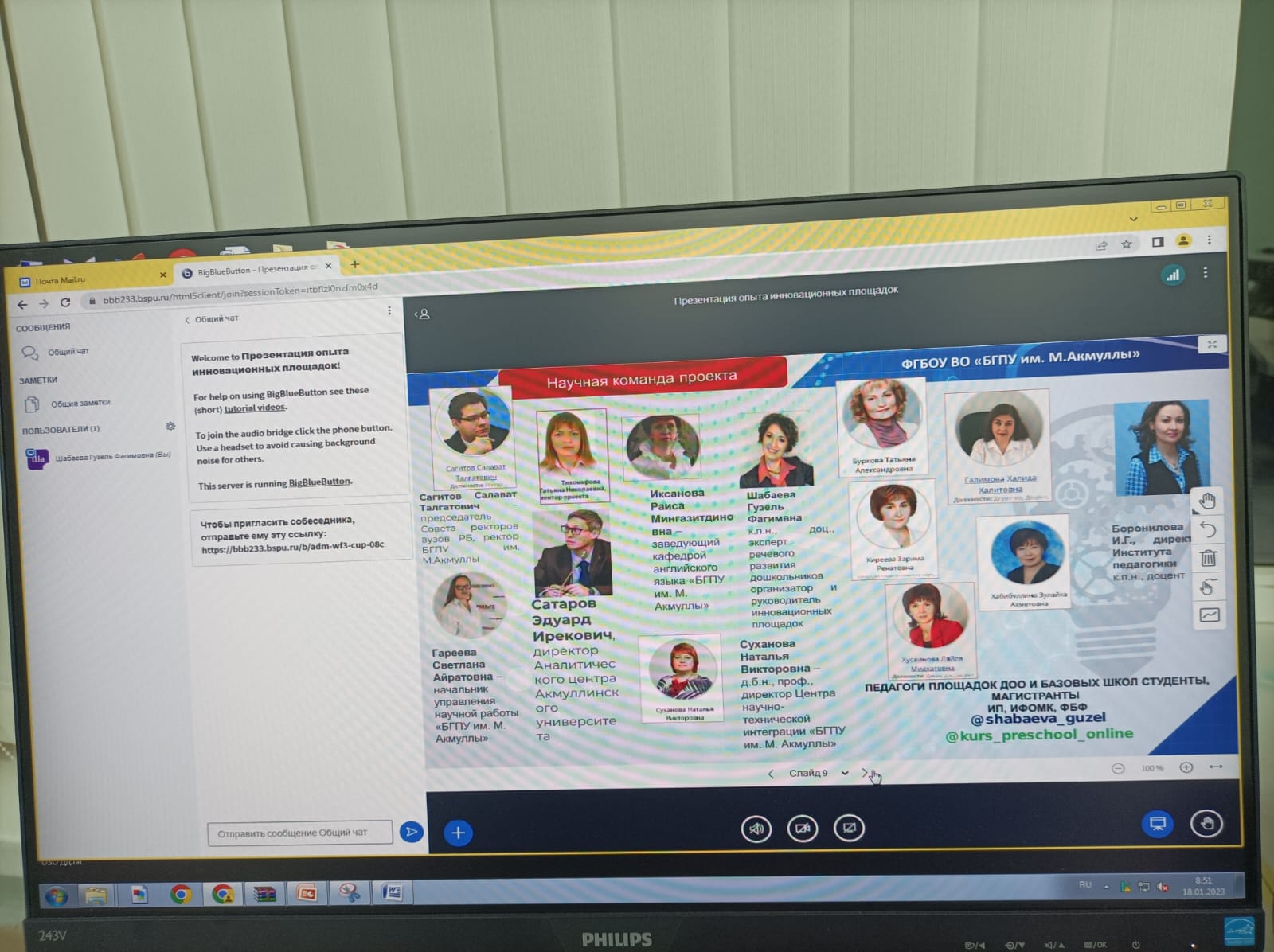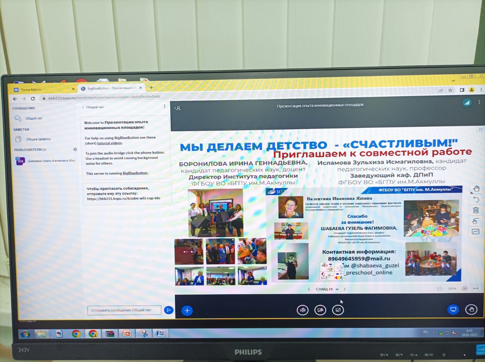 - проведение  ТЕЛЕМОСТА на базе bbb bspu с педагогами инновационных площадок и работа со студентами, магистрантами по презентации опыта инновационных площадок ( зав. каф. ДПиП Исламова З.И., к.п.н., доц. Шабаева Г.Ф. (студенты 4 курса «Дошкольное образование»; подключение: педагоги инновационных площадок г. Благовещенск (МАДОУ ЦРР д/с 11,15,16; г. Уфы: МАДОУ 60, 107, 92, 264); зав.каф.ТиМНО Янгирова В.М., к.п.н., доц.Савельева (с МАОУ Башкирской гимназии-интернат г. Белебея РБ (инновационная площадка БГПУ им. М. Акмуллы);