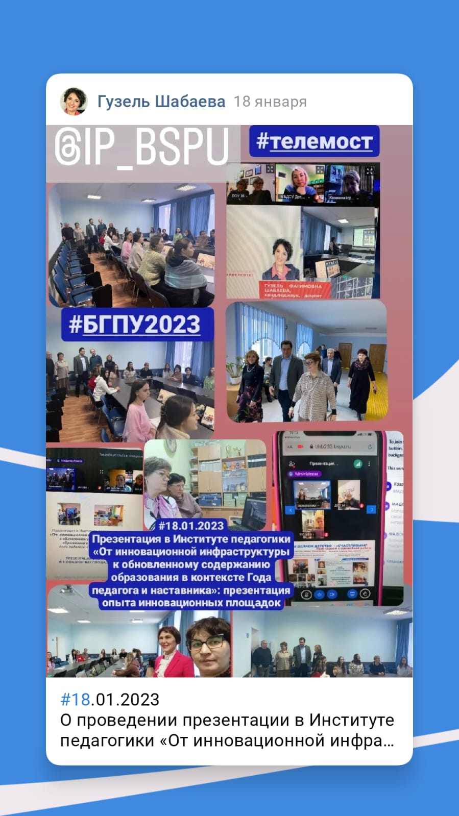 18.01.2023 г. прошла презентация в Институте педагогики «От инновационной инфраструктуры к обновленному содержанию образования в контексте Года педагога и наставника»: презентация опыта инновационных площадок: