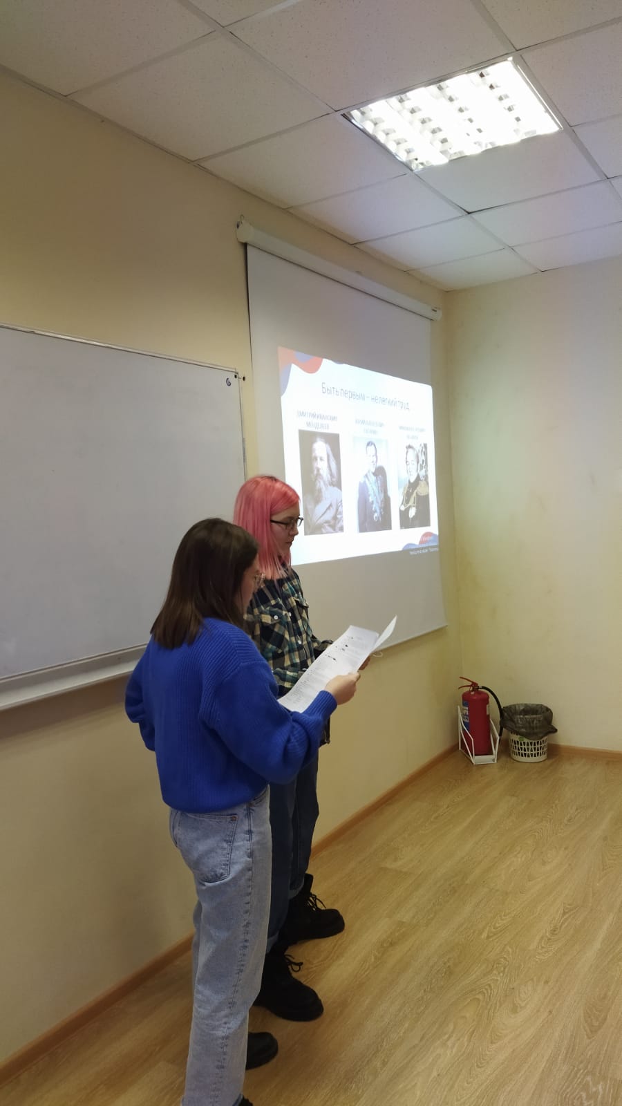 Беседу провели студентки 4 курса направления подготовки Социальная работа, профиль «Социальная защита и социальное обслуживание семей и детей», Ягафарова Айгуль, Садыкова Ангелина, Катанова Анна и Махиянова Розалина  (руководитель ОПОП – А.Ф. Фазлыева, канд.пед. наук, доцент кафедры ПиСО). Они рассказали о том, что быть первыми - это нелегкий, но активный труд.
