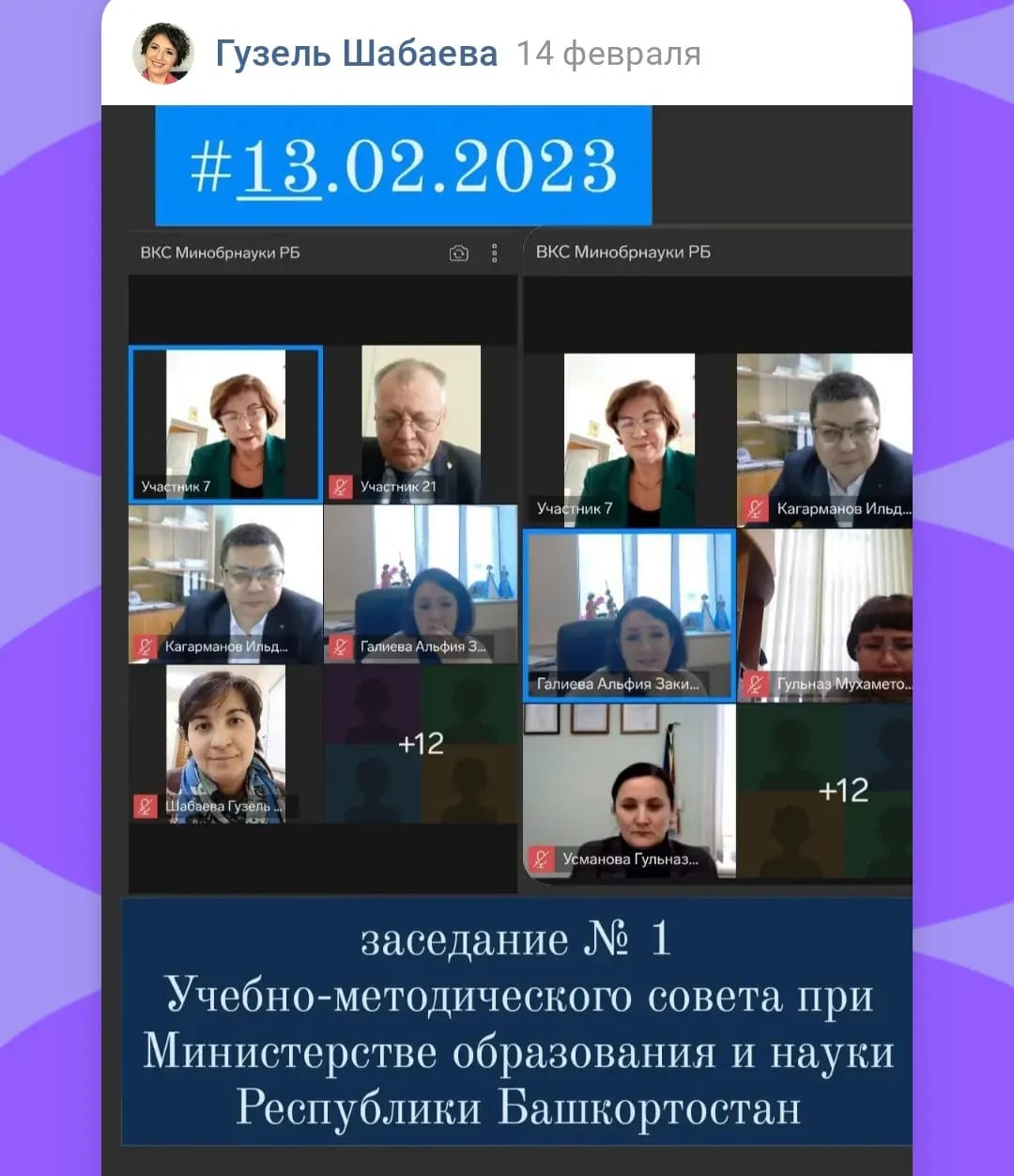 13.02.2023г. Шабаева Г.Ф., к.п.н., доц. приняла участие в  заседании № 1 Учебно-методического совета при Министерстве образования и науки Республики Башкортостан в режиме видеоконференцсвязи.