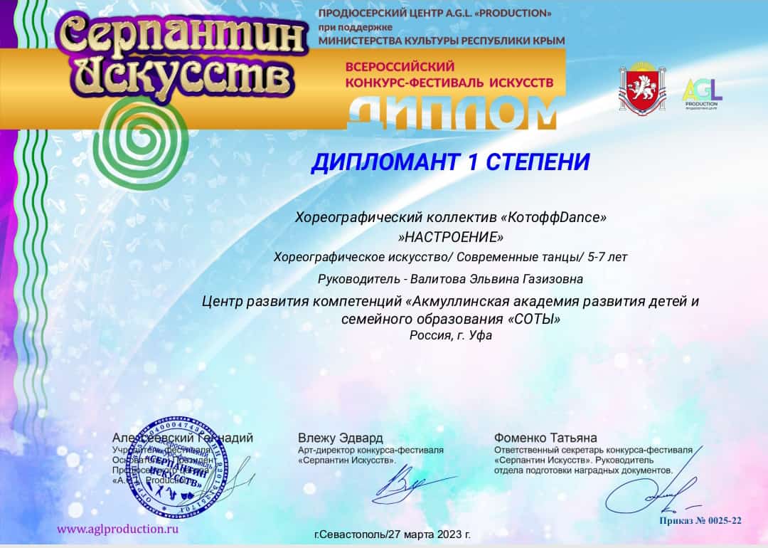 Участницы хореографического коллектива Акмуллинской академии развития детей и семейного образования БГПУ им.М.Акмуллы  стали дипломантами 1 степени во ВСЕРОССИЙСКОМ КОНКУРС-ФЕСТИВАЛЕ ИСКУССТВ «Серпантин искусств», в номинации «Хореографическое искусство/Современные танцы».