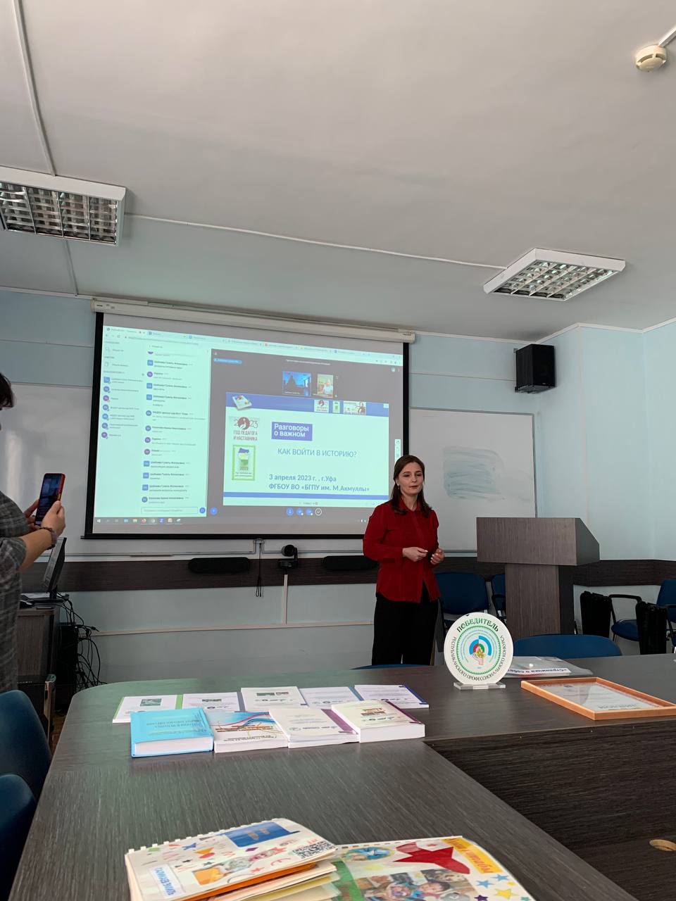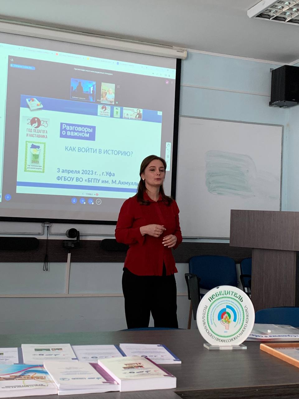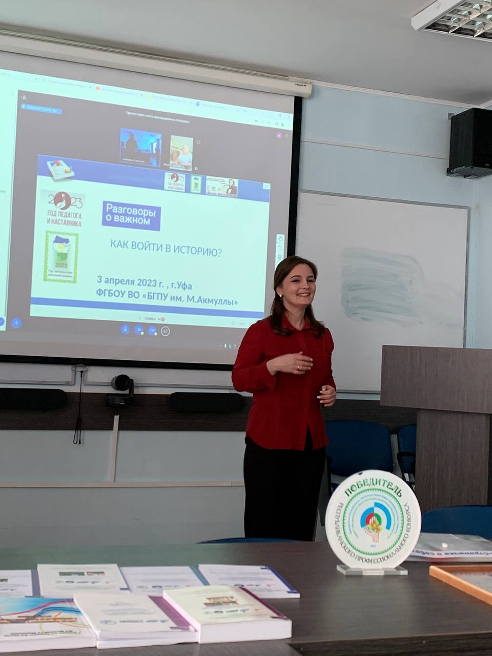 Разговор о важном «КАК ВОЙТИ В ИСТОРИЮ»? Приглашен для участия во Всероссийском проекте «Разговор о важном» Победитель республиканского конкурса «Педагог года дошкольной образовательной организации Республики Башкортостан», г. Уфа 2023 г. БАКИЕВА АРИНА ВАЛЕРЬЕВНА в рамках года педагога и наставника, которая с к.п.н., доц. Шабаевой Г.Ф., директором ИП Борониловой И.Г., зам.директора по УР ИП Калмыковой Т.С.  провела презентацию «История моей Педагогической династии». Арина Валерьевна рассказала о своем педагогическом пути, начале карьеры и становлении в профессии, особый интерес вызвал рассказ о дедушке –докторе технических наук, профессоре, а также от студентов  много вопросов было по подготовке и участию в республиканском конкурсе. Участник мероприятия бойко, с задором  отвечала на вопросы студентов, магистрантов и опытных педагогов-супервизоров инновационных площадок кафедры посредством ТЕЛЕМОСТА bbb lms bspu