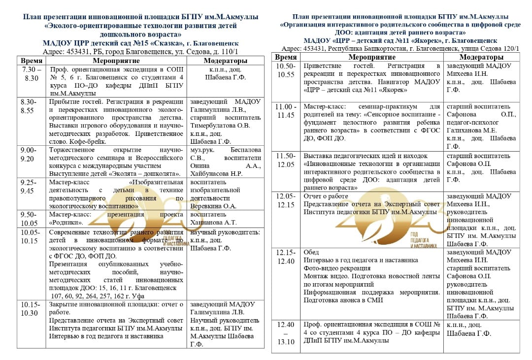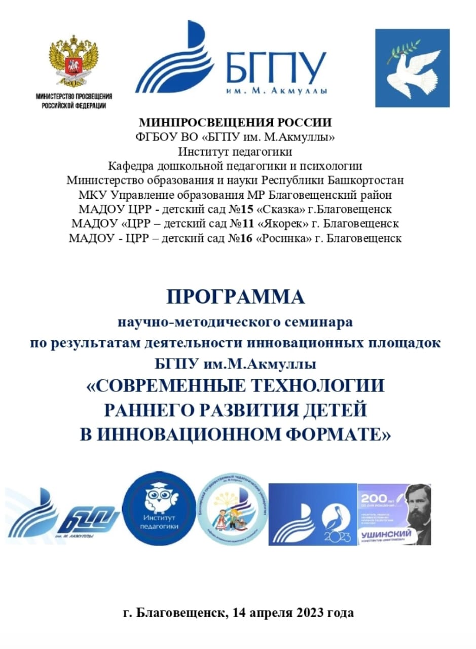 14 апреля 2023 г. при поддержке МИНПРОСВЕЩЕНИЯ РОССИИ, ФГБОУ ВО «БГПУ им. М.Акмуллы», Министерство образования и науки Республики Башкортостан, МКУ Управление образования МР Благовещенский район на базах МАДОУ детский сад №15 «Сказка»,  МАДОУ детский сад №11 "Якорек", МАДОУ детский сад №16 "Росинка" г.Благовещенск пройдет научно-методический семинар и Всероссийский конкурс методических разработок  по результатам деятельности инновационных площадок БГПУ им.М.Акмуллы «СОВРЕМЕННЫЕ ТЕХНОЛОГИИ РАННЕГО РАЗВИТИЯ ДЕТЕЙ В ИННОВАЦИОННОМ ФОРМАТЕ».