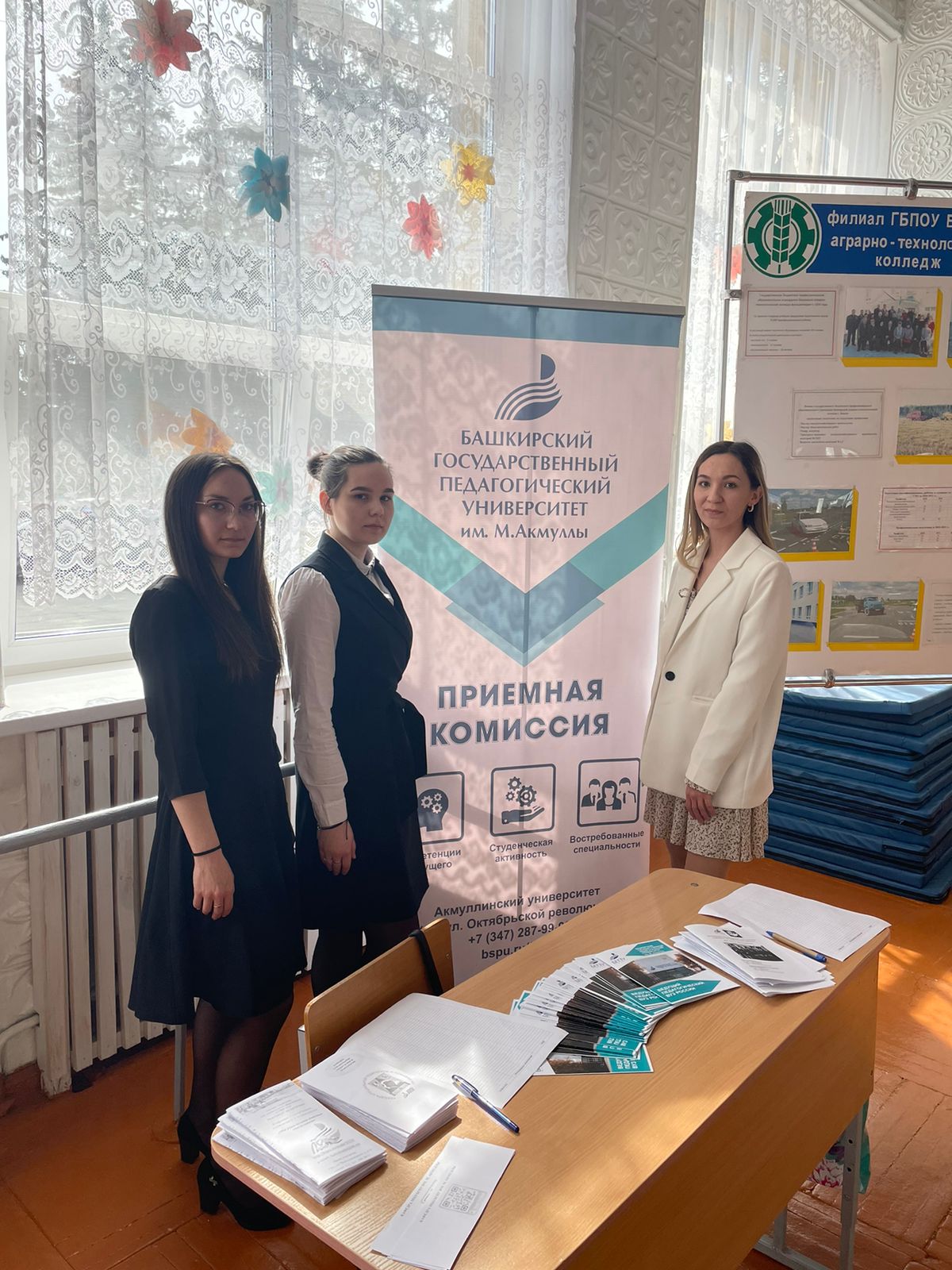 13 апреля 2023г. профориентационный выезд на ярмарку вакансий, организованной в рамках фестиваля  ПРОФфест в с.Бакалы Республики Башкортостан. О поступлении в башкирский государственный педагогический университет им. М.Акмуллы, преимуществах поступления выступила зам. директора по УР Хафизова К. М., о студенческой жизни рассказали студентки 3 курса профиль "Начальное образование" Козлова К. А. Сулейманова А. Р.