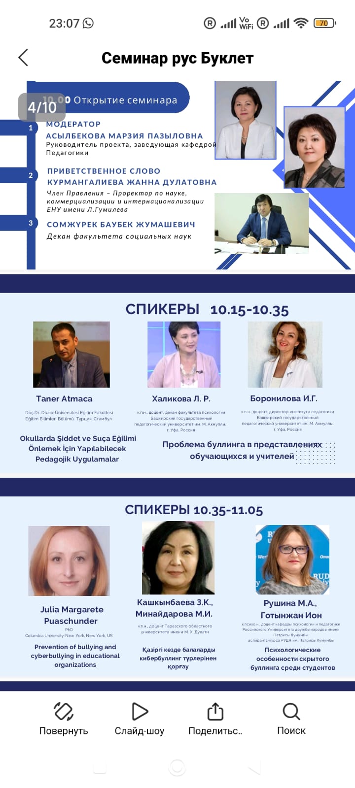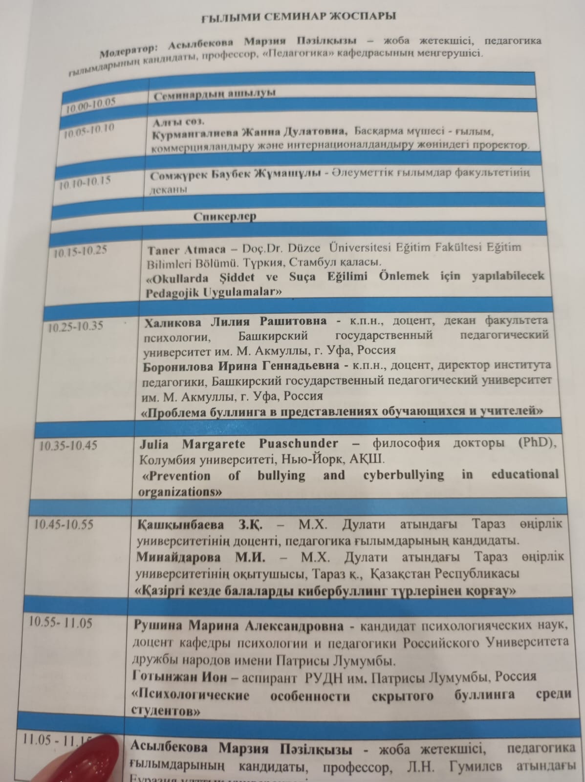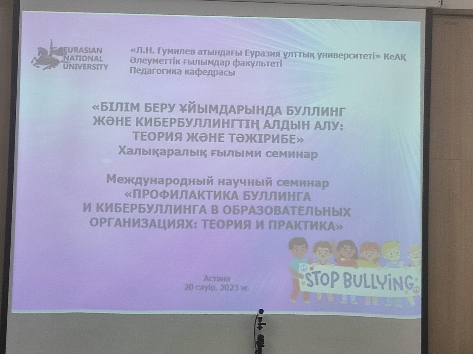 В семинаре приняли участие ученые дальнего и ближнего зарубежья - Турции, США, России, Казахстана.  Были представлены доклады по теме, состоялся обмен мнениями. Мероприятие организовано в рамках целевого проекта «Исследование актуальных аспектов и выработка мер по превенции буллинга в отношении детей», организованный руководителем проекта, заведующей кафедрой педагогики Марзиёй Асылбековой.