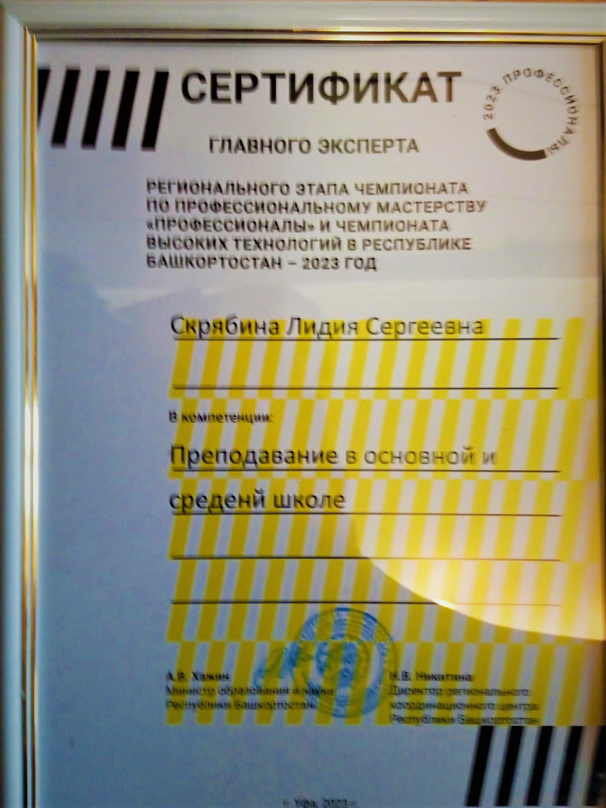 Кандидат педагогических наук, доцент кафедры педагогики БГПУ им. М.Акмуллы Скрябина Лидия Сергеевна награждена сертификатом за работу в качестве главного эксперта в компетенции  «Преподавание в основной и средней школе» на Региональном этапе чемпионата по профессиональному мастерству «Профессионалы» и чемпионата высоких технологий в Республике Башкортостан – 2023