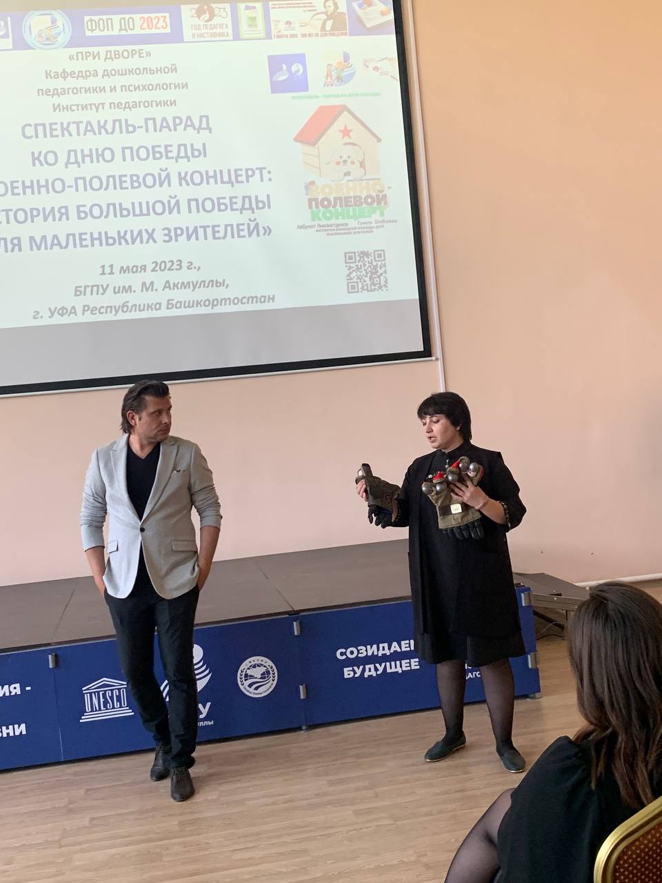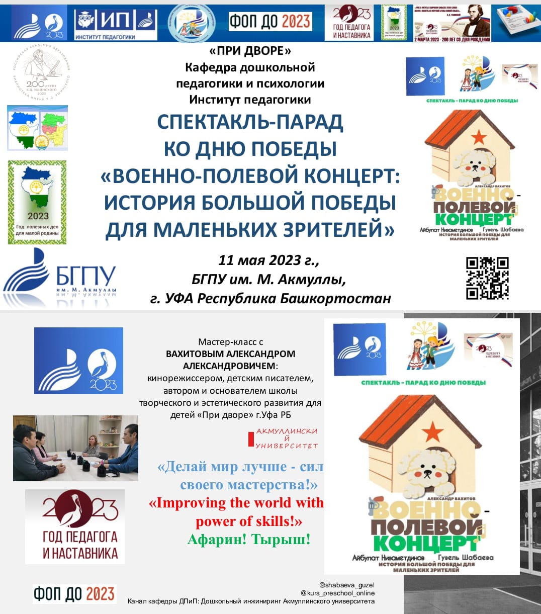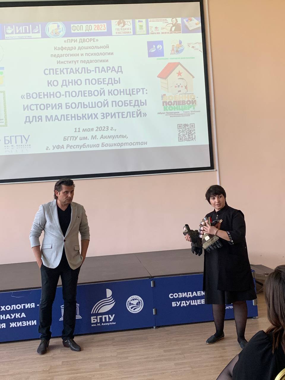 "Я, Мухаметянова Алсу Маликовна, из группы 11ДО22-21(24) 11 мая посетила спектакль-парад ко Дню Победы  "Военно-полевой концерт: история большой Победы для маленьких зрителей". Я была в восторге от данного представления, особенно мне понравились актеры, которые на уровне исполняли свои роли. После мероприятия у нас была лекция с режиссером Александром Вахитовым, который рассказал нам о том, как в инновационном формате  проводить праздники в детском саду. Особенно мне понравилось его умение преподнести тему в лёгкой, доступной форме. Я считаю, что его разработки смогу использовать в дальнейшей профессии".