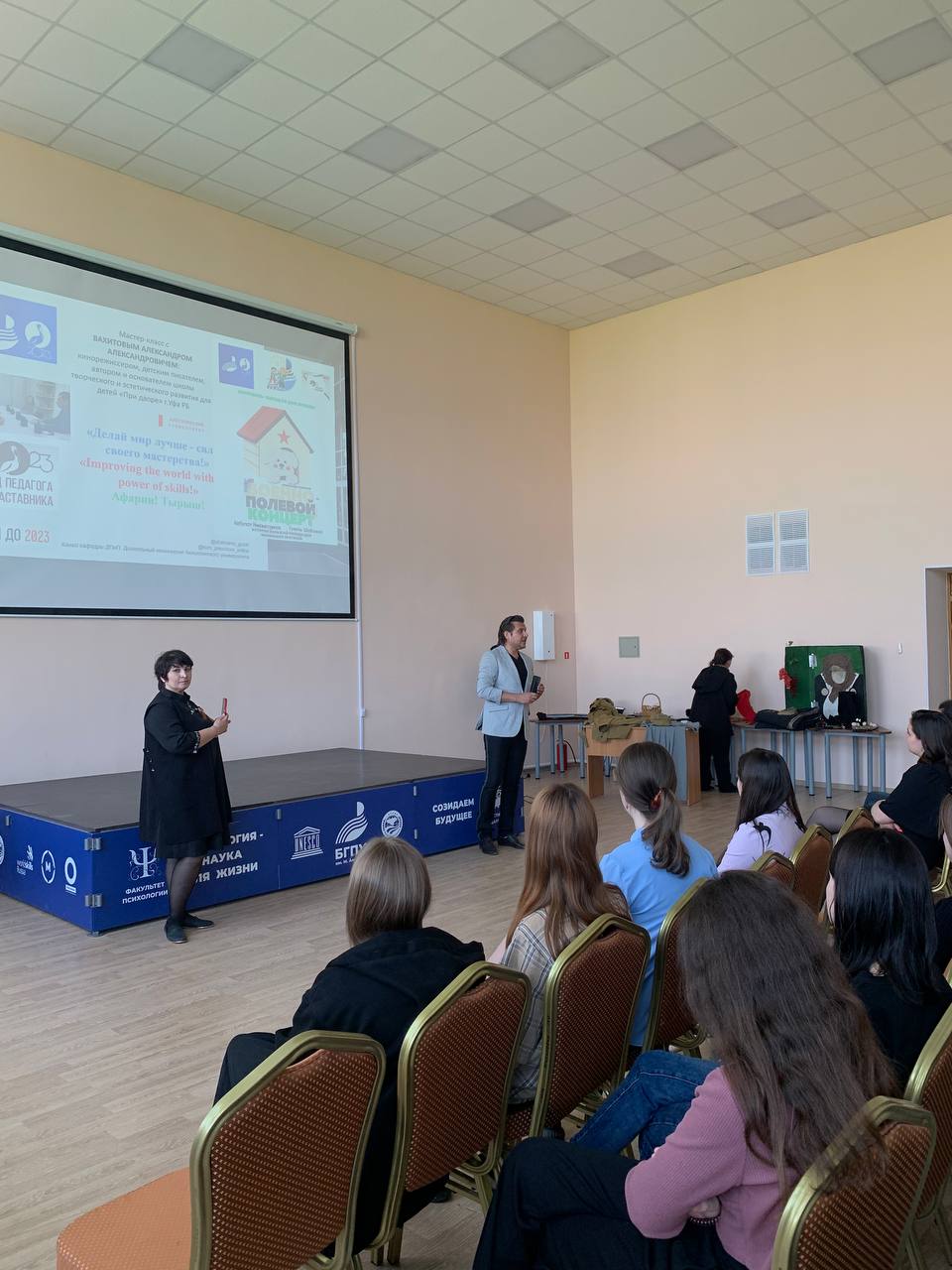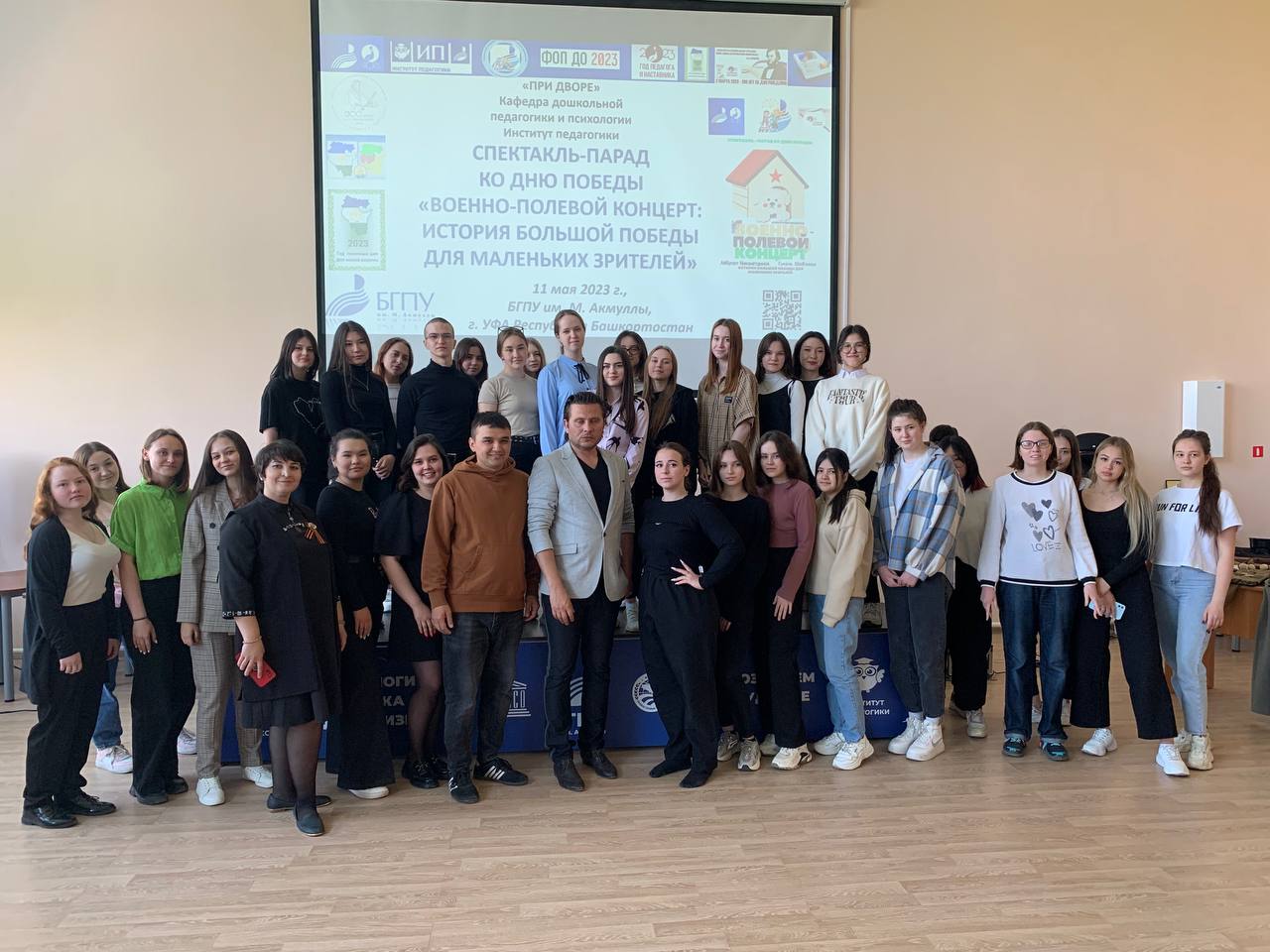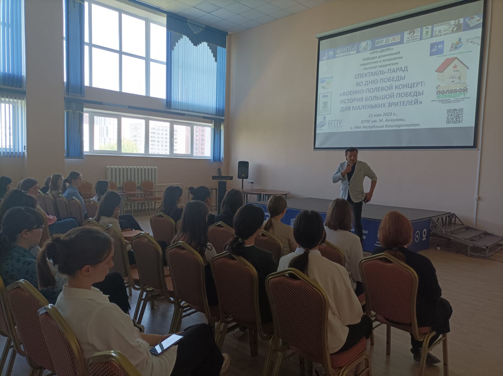 Научно-методический семинар с мастер-классом в соответствии с требованиями ФОП ДО, ФГОС ДО на кафедре ДПиП по театрализованной деятельности воспитанников  с приглашенным  кинорежиссером и детским писателем по постановке и показу в Акмуллинском университете Спектакль-парад ко Дню Победы "Военно-полевой концерт: История большой победы для маленьких зрителей " - как продукт социально-образовательного инжиниринга кафедры ДПиП