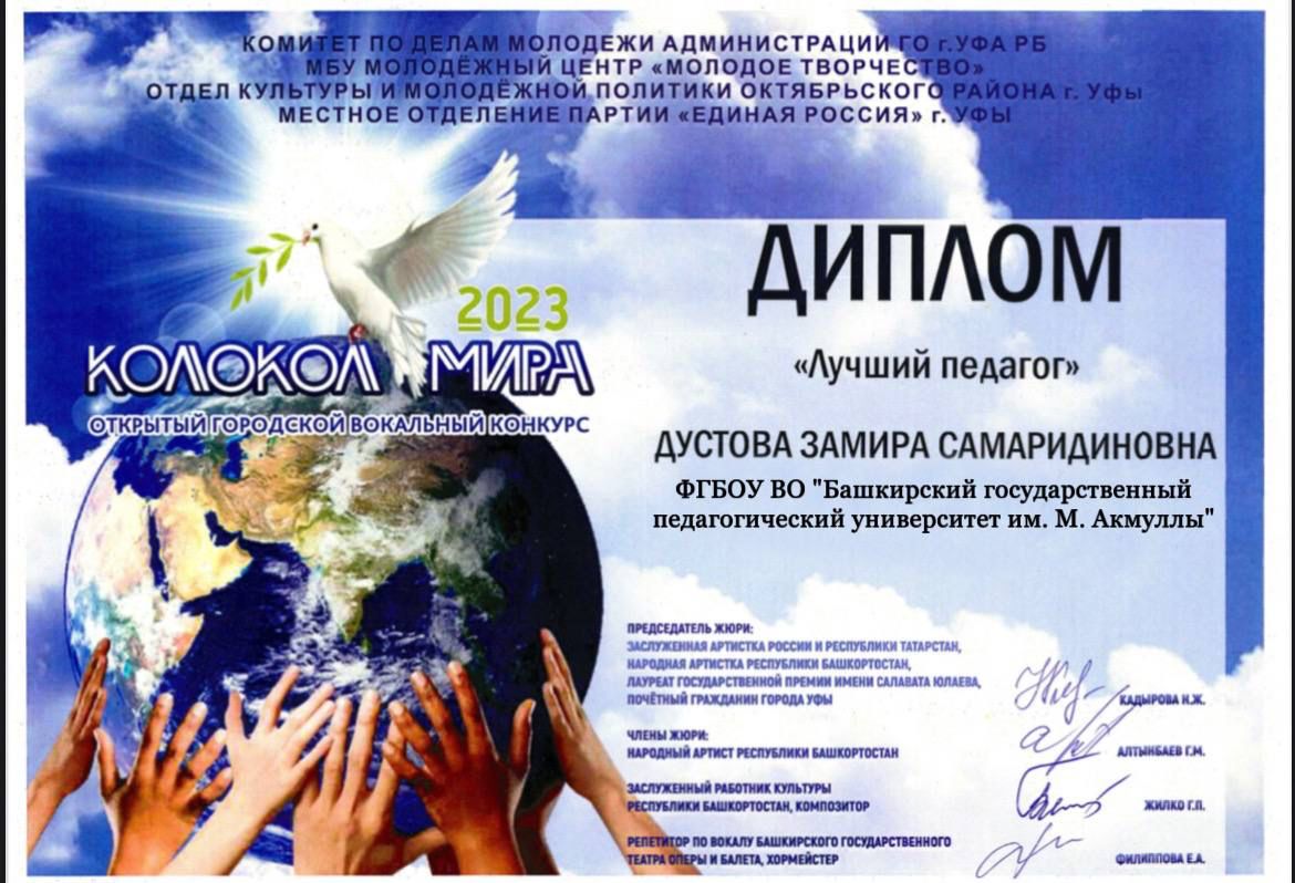 10 мая 2023 года в Республиканском музее Боевой Славы состоялся Гала-концерт Открытого городского вокального конкурса «Колокол мира», на котором за особые достижения подопечных студентов старший преподаватель кафедры музыкального и хореографического образования Замира Дустова.была награждена дипломом "Лучший педагог"