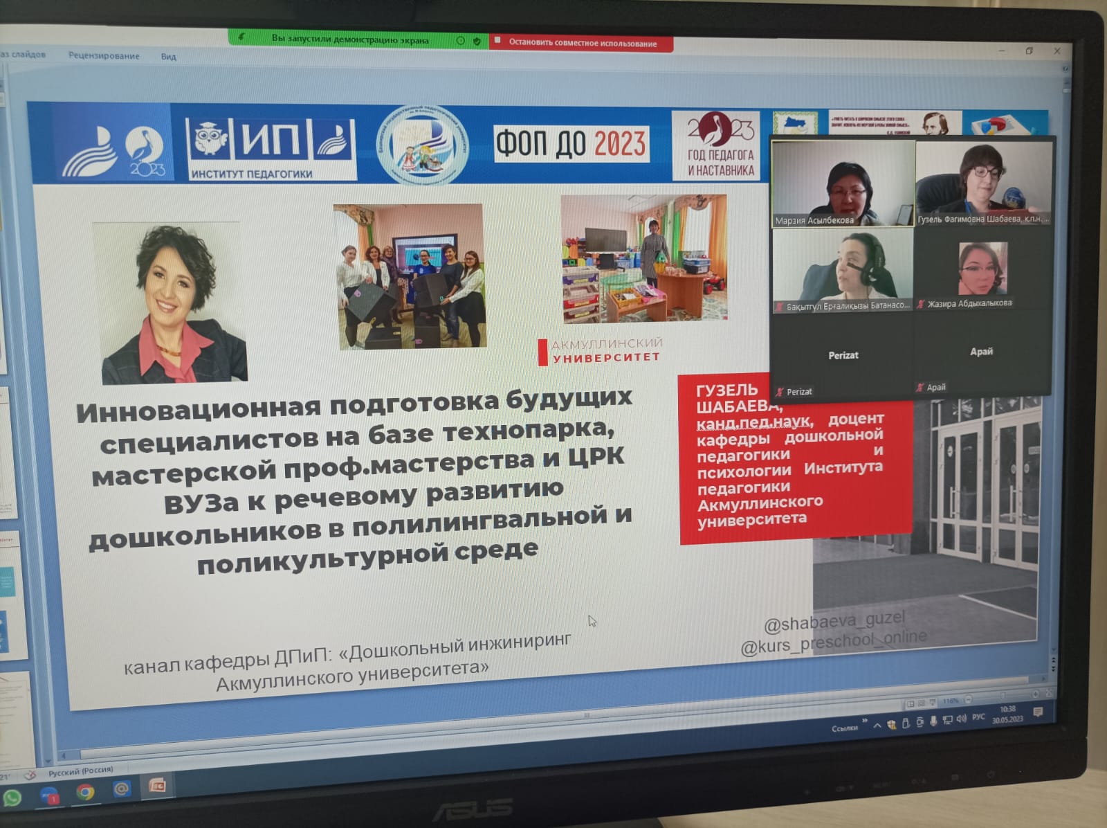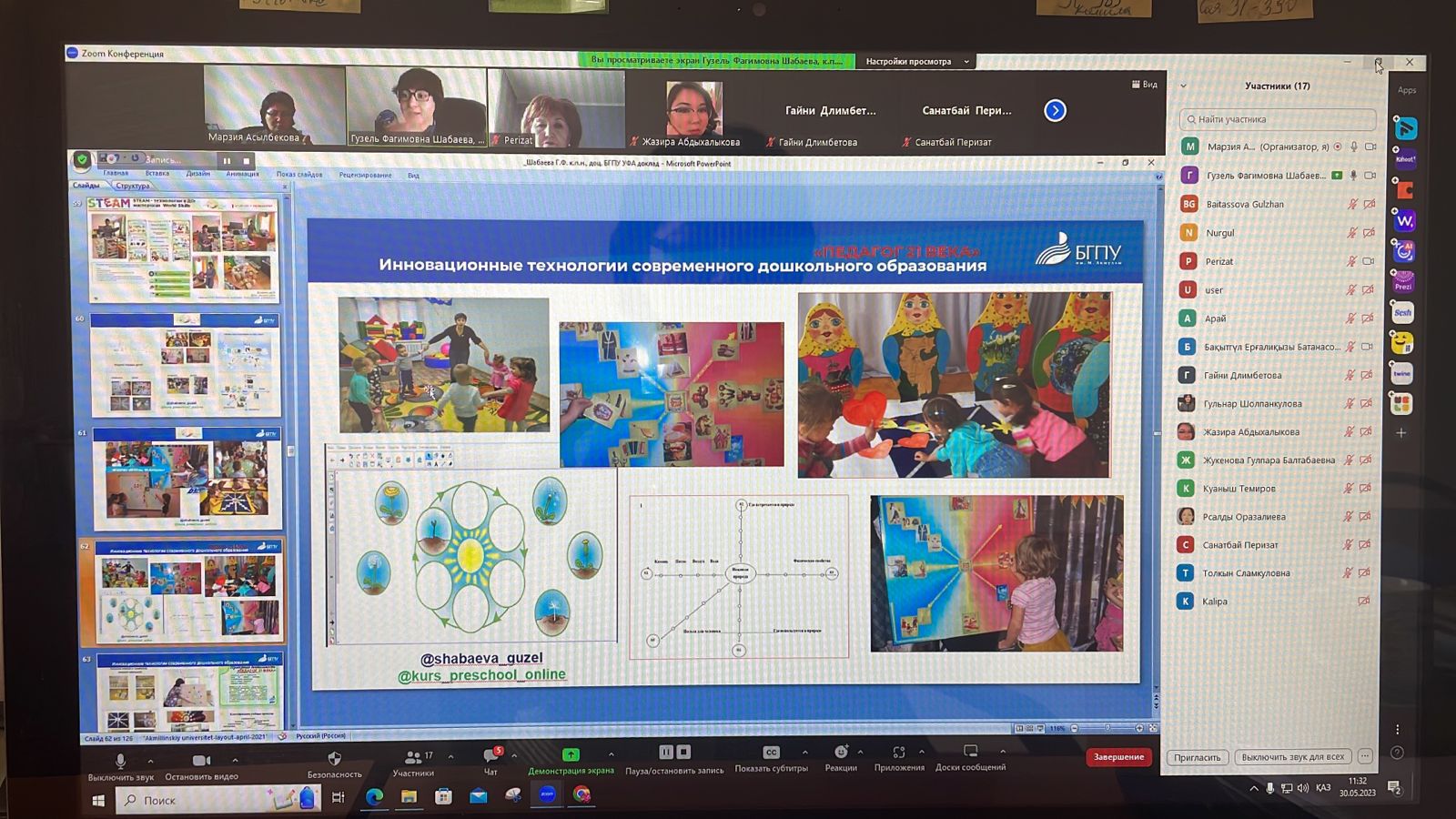 Шабаева Г.Ф., к п.н., доц., и.о. зав.каф. ДПиП выступила с докладом на тему " Инновационная подготовка будущих специалистов на базе технопарка, мастерской проф мастерства , центра развития компетенций ВУЗа к речевому развитию дошкольников в полилингвальной и поликультурной среде", где  Шабаевой Г Ф. и Борониловой И.Г., к.п.н., доц. , директором ИП  представлен опыт работы по реализации современных технологий раннего развития детей в полилингвальном и поликультурном пространстве детства на базе технопарка универсальных педагогических компетенций и ЦРК, проф. мастерской Шабаевой Г.Ф. представлена выставка опубликованных  научно-методических пособий кафедры дошкольной педагогики и психологии Института педагогики БГПУ имени Мифтахетдина Акмуллы