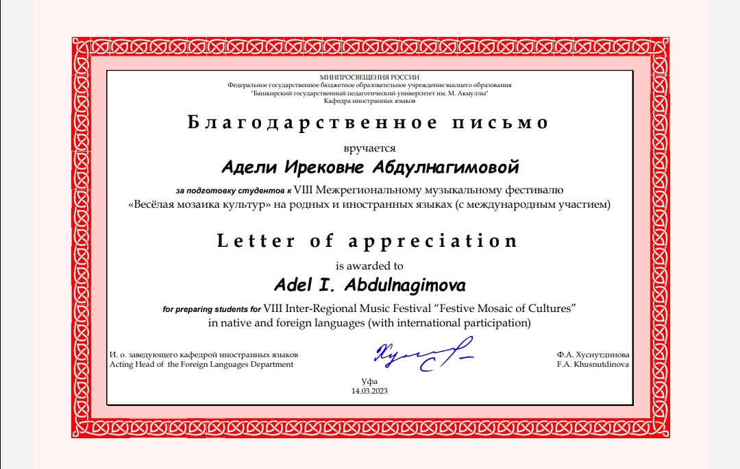 Ариана Галлямова (класс к.п.н., доцента кафедры Заббаровой М. М.) - Лауреат III степени.