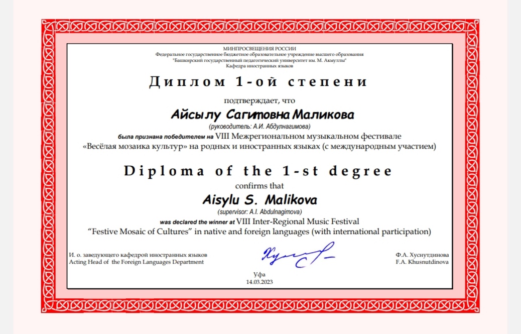 Айсылу Маликова (класс старшего преподавателя Абдулнагимовой А. И.) - Лауреат I степени,